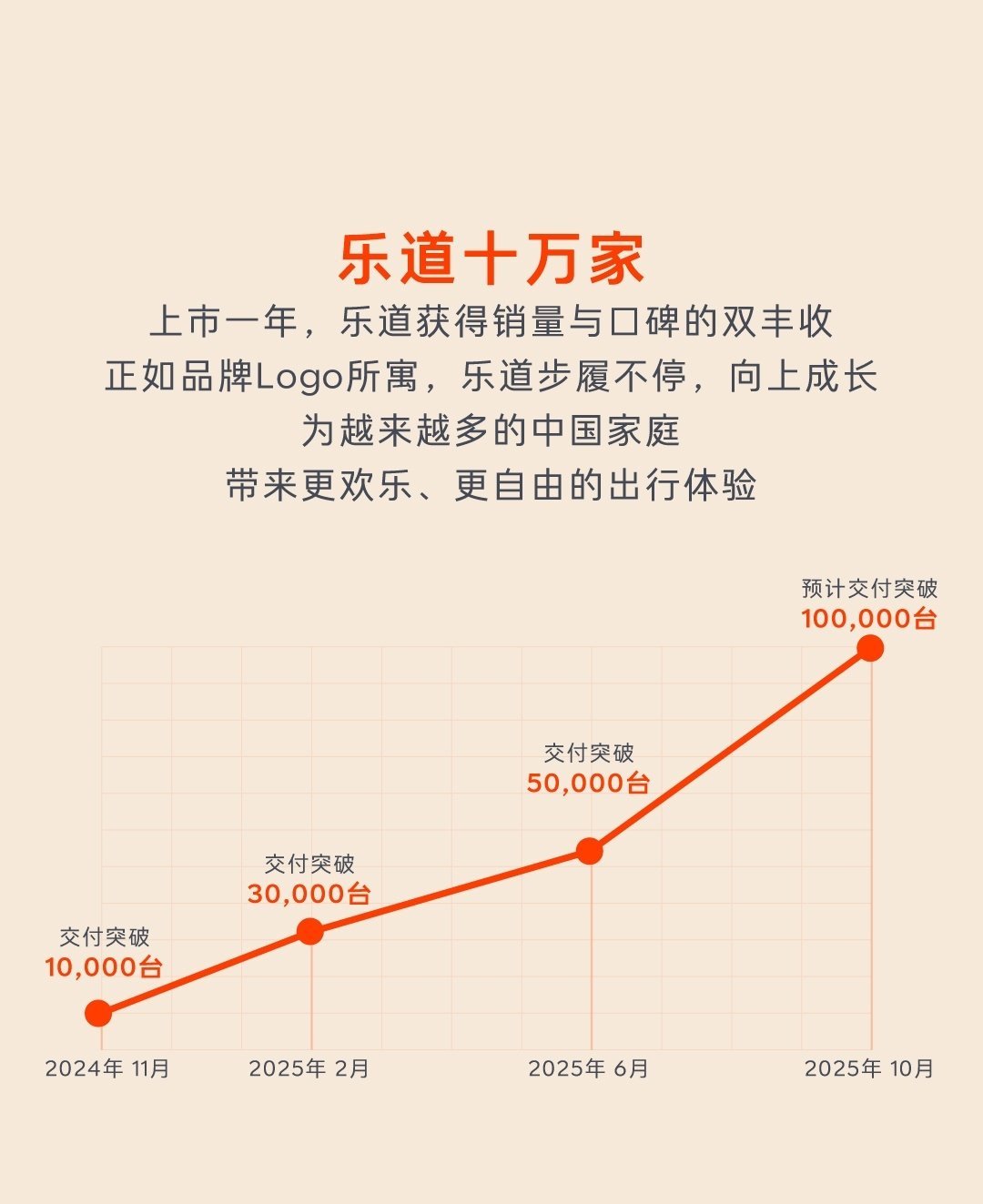 根据介绍,乐道品牌去年 11 月交付突破 10000 台,今年 2 月突破 30000 台,随后在今年 6 月突破 50000 台,并将在约 4 个月的时间内迎来 10 万台交付。