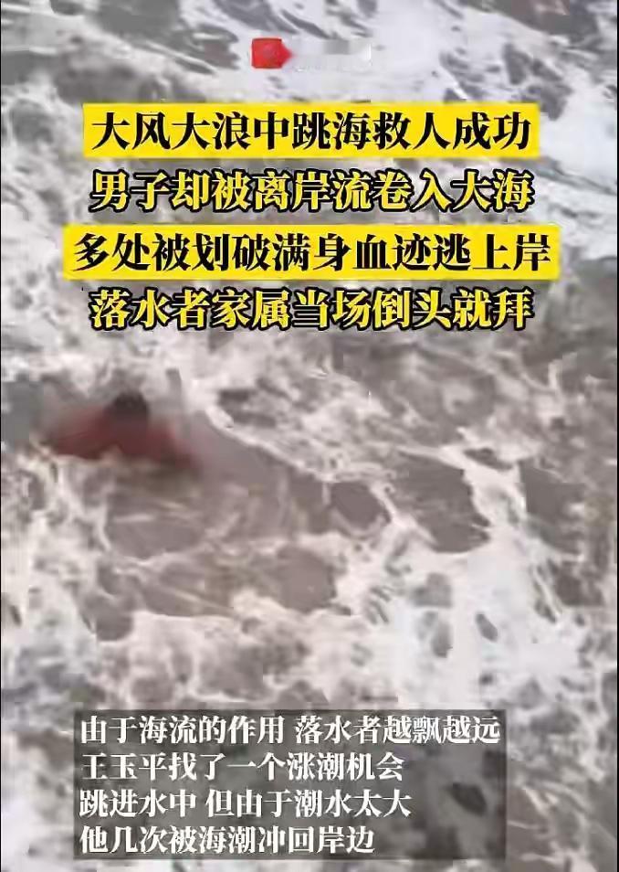 江苏连云港一男子惊涛中救人被卷入大海,全身被划破带血成功上岸,落水者家属当场倒头就拜 江苏连云港,连云区西大堤海边刮起六七级大风,一名居民落水。据市游泳协会会员王玉平,闻讯后跳入水中救人。他告诉潇湘晨报记者,当时潮水汹涌,他几次被冲回岸边,额头被礁石割破,鲜血直流,但他仍坚持向落水者游去,最终将落水者托举上岸。 随后,他被强浪卷回大海,狂风大浪把他拖走很远,好在他竭尽全力游回岸边,又接住救生圈,被拖上岸。王玉平身上多处流血。落水者家属感激不已,网友称赞王玉平为真正的英雄!