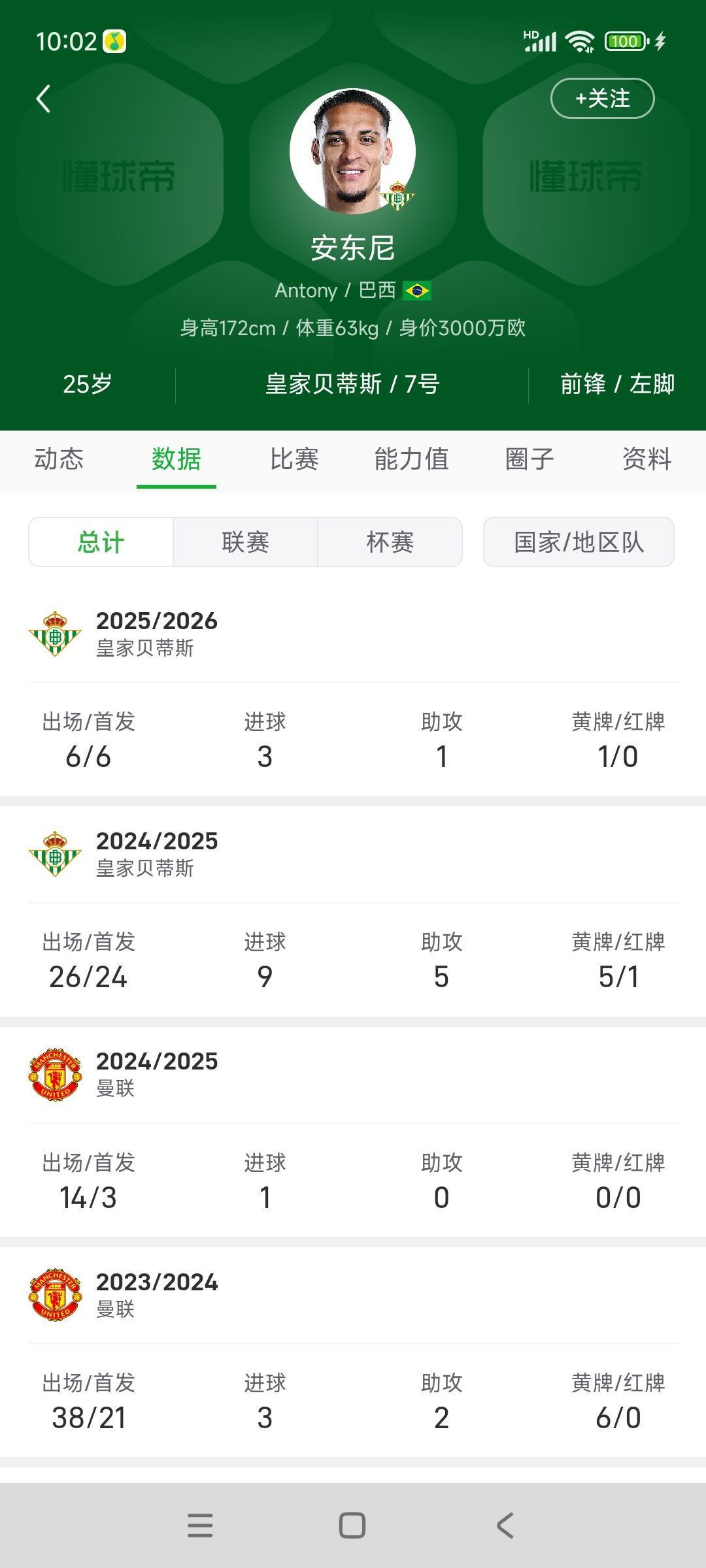 本赛季吹捧安东尼的人真少,看来热度过了回归正常。 这是他新赛季数据,6场3球1助攻,皇家贝蒂斯排名西甲第五。 一个人拖着中下游球队,能进欧冠就是胜利,哪怕参加联盟杯都不错。 安东尼可是1亿身价的巨星!真强。[呲牙]