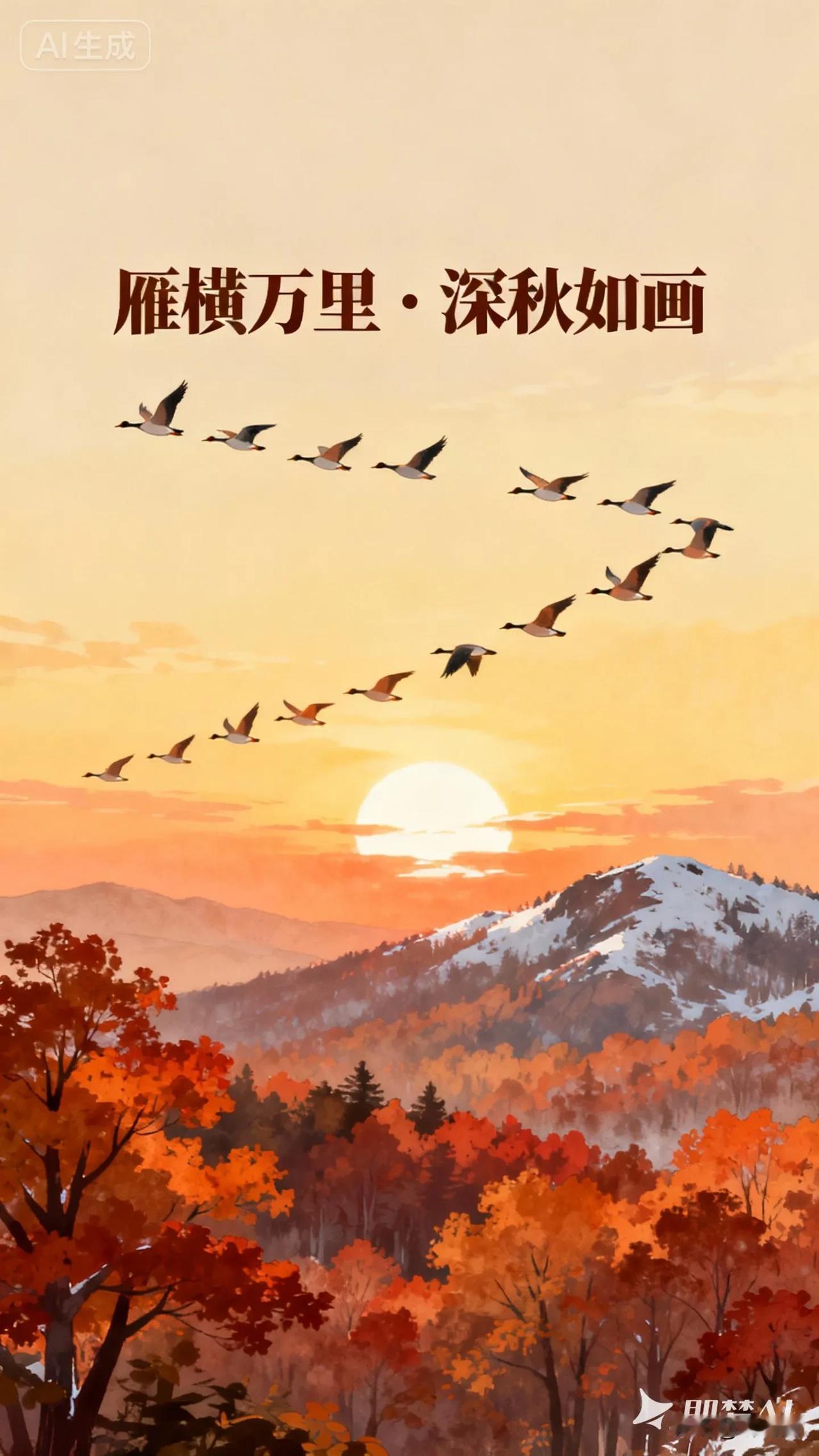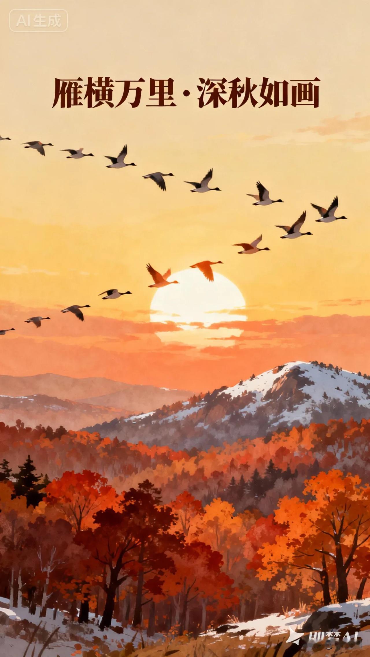 上联:枫染千山,醉染秋光浓烈 下联:雁横万里,长横暮色苍茫 横批:深秋如画