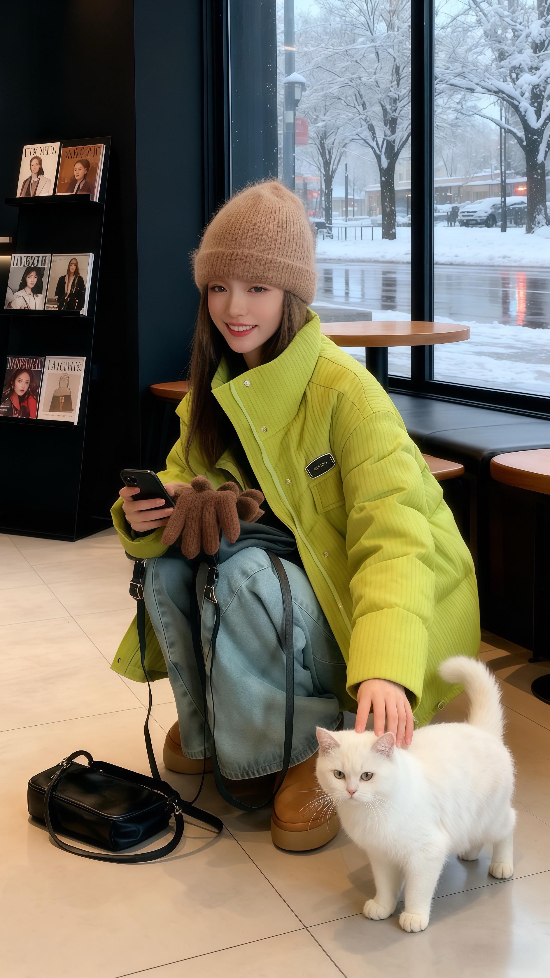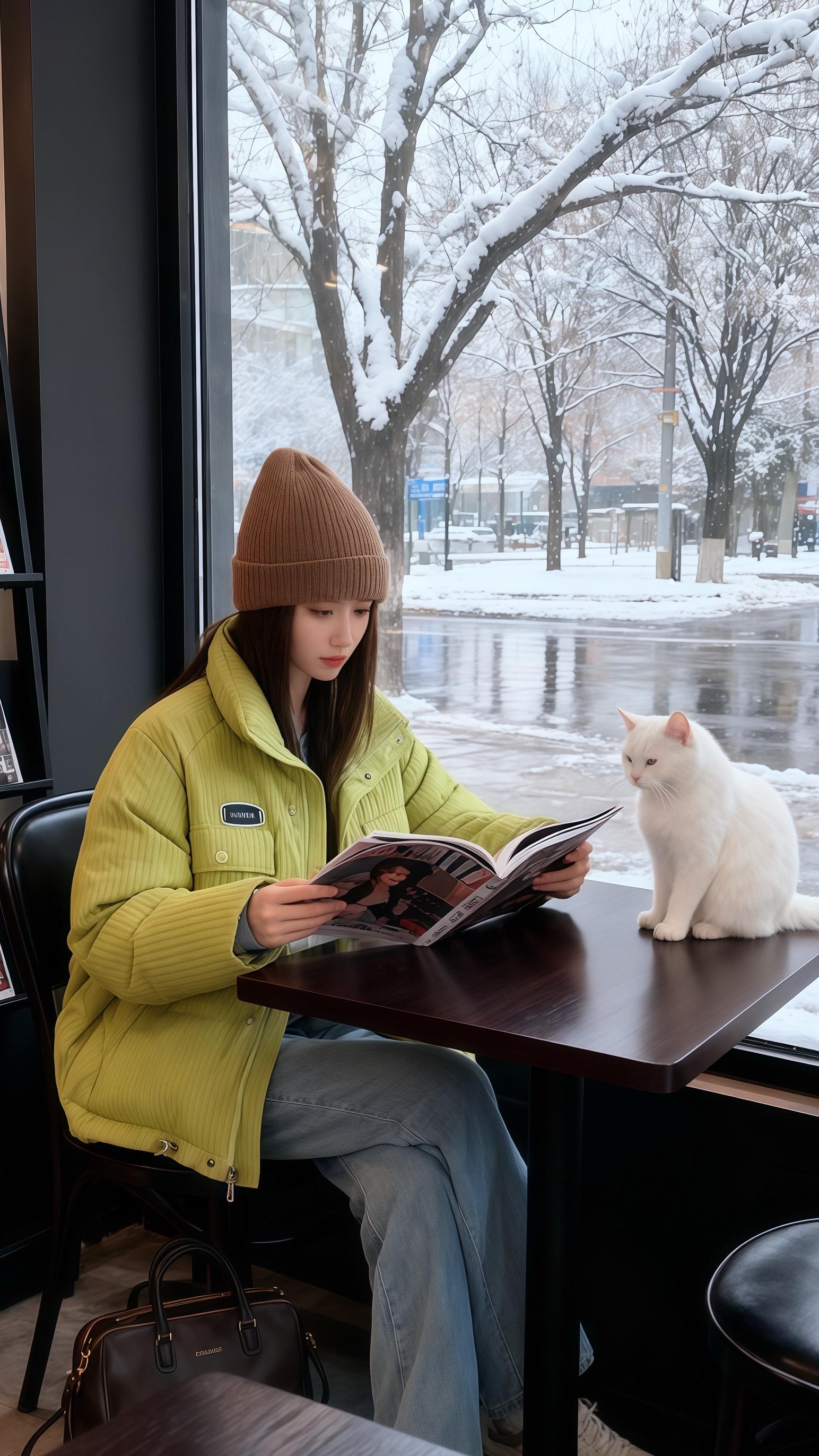 拐进常去的猫咖,暖光瞬间包裹全身。她蹲下身,指尖抚过白猫软乎乎的毛,手机里还存着刚才在橱窗前的自拍。邻桌的杂志摊开着时尚特辑,她索性坐下来翻读,猫咪跳上桌面,圆眼睛好奇地盯着那些穿搭大片,仿佛在品鉴她身上这件羽绒服的“时尚度”。