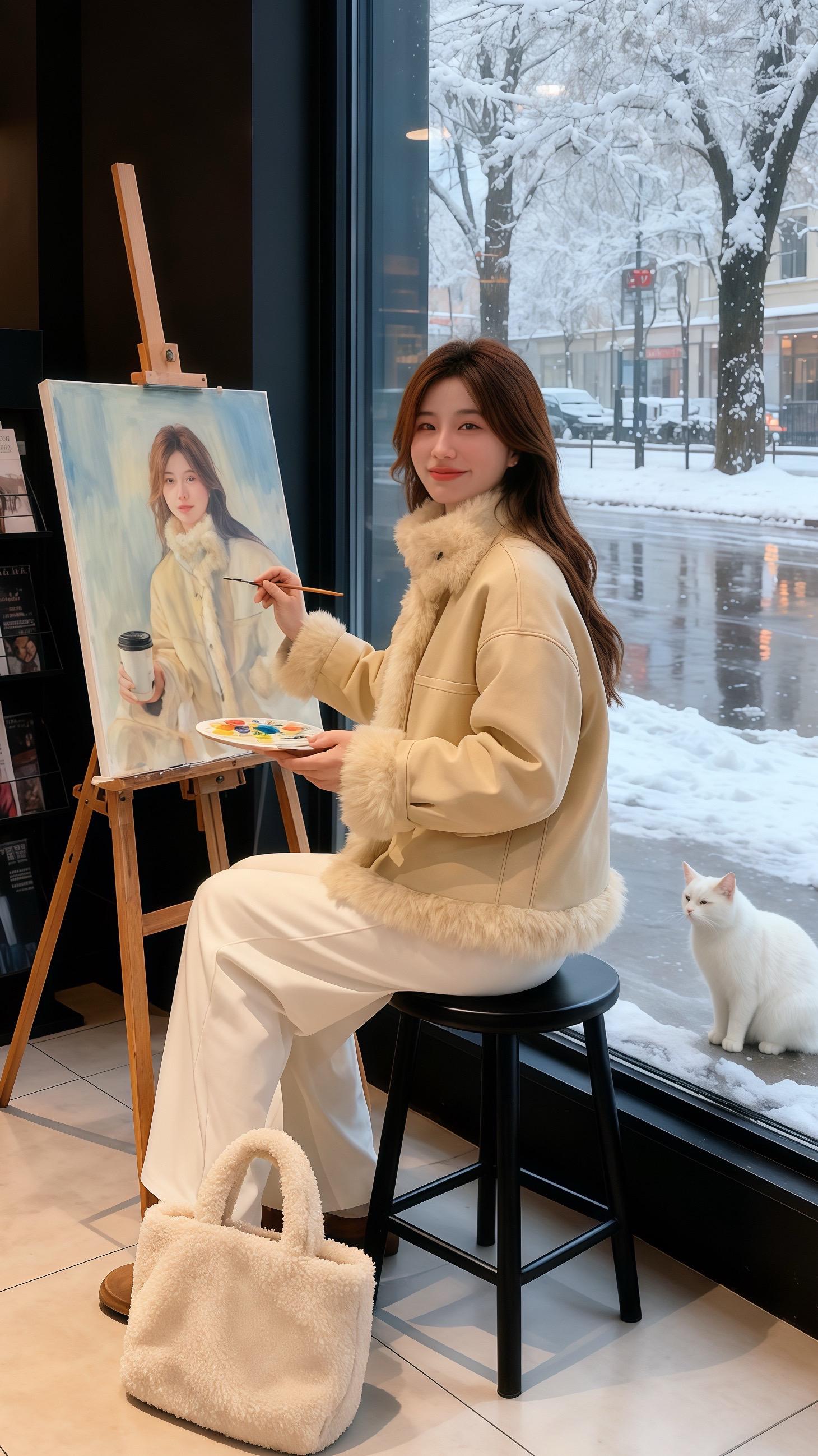 她穿着它走过积雪的街道,棕色毛绒拖鞋踩出咯吱轻响,引得咖啡馆里的白猫都探头张望。在画室里,她执起画笔,外套的毛绒边蹭过画布,像是给色彩都镀上了一层暖绒。