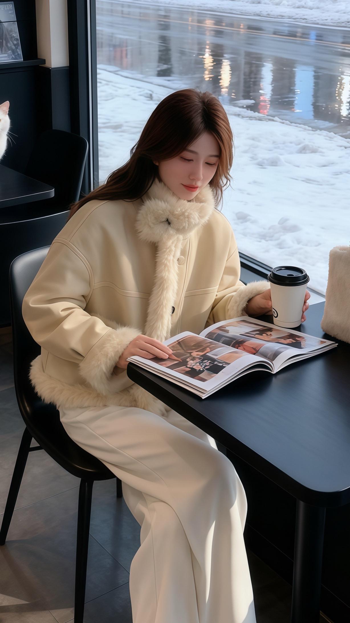 午后的咖啡馆,她捧着杂志,米白阔腿裤衬得身姿慵懒又优雅,手中的热饮氤氲了玻璃窗上的霜花。那件外套成了她的冬日符号,从梧桐街的橱窗,到画室的画架旁,再到咖啡馆的暖阳里,把雪城的冷冽都熨帖成了温柔的模样。