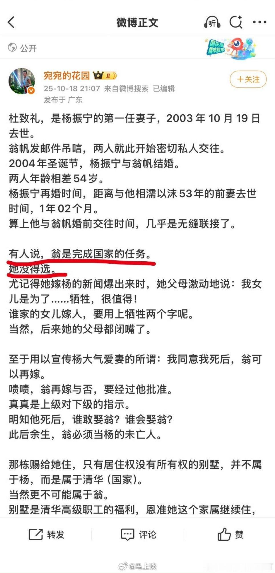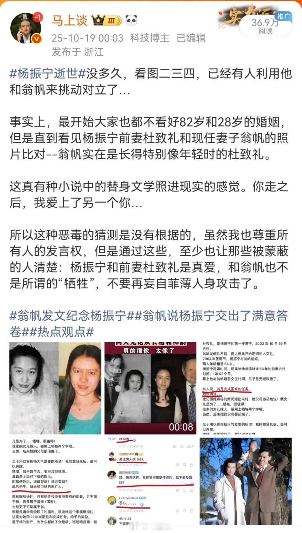 漂亮~网民因造谣诋毁杨振宁和翁帆被永久禁言。这种老谣言在一二十年前是真多,现在还这样,那真的是别有用心。我只是稍稍解释了下翁帆不是她所谓的“牺牲”,而是与杨振宁第一任妻子杜致礼非常向像,居然被拉黑了…[吃瓜]