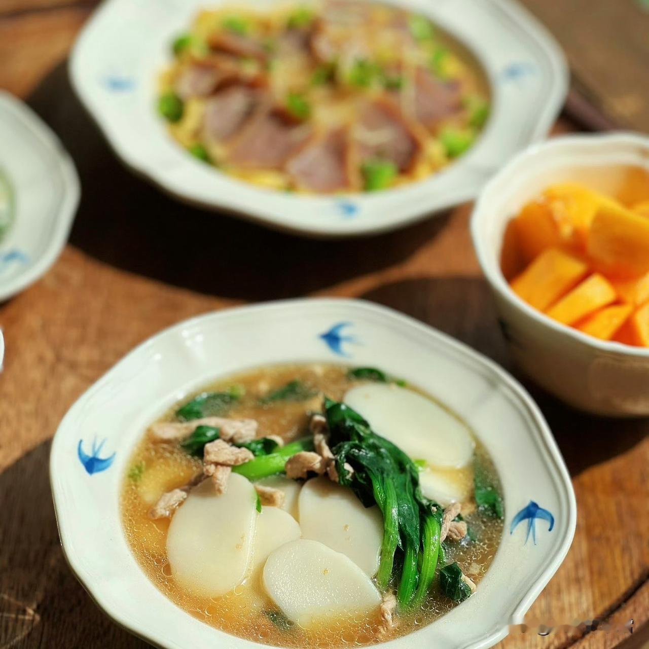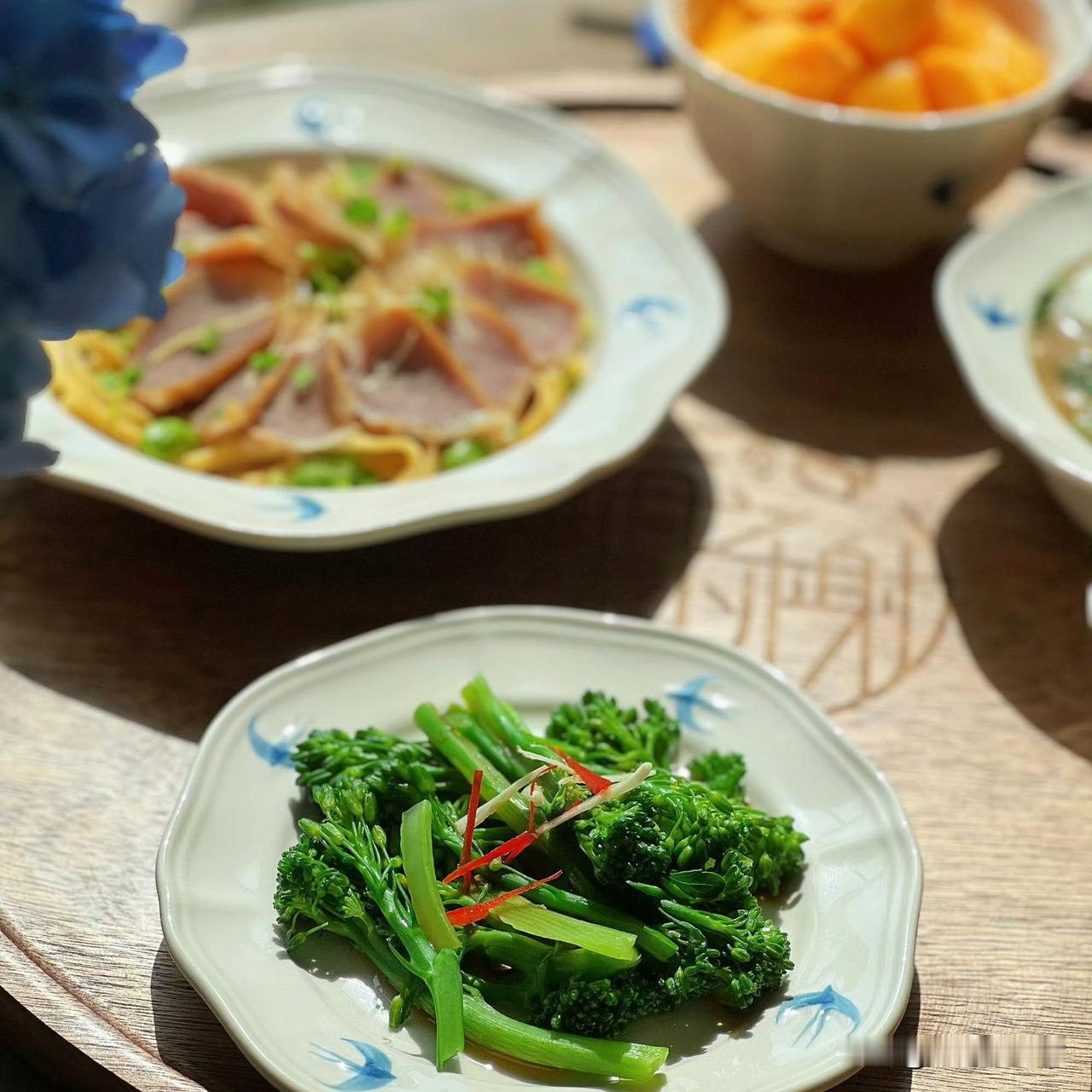 在阳光的温柔铺陈里,一碗青菜肉丝年糕汤暖意融融,裹着烟火气的慰藉;一盘火腿拌面滋味绵长,每一口都是舌尖的满足;清炒西兰苔脆嫩爽口,还有清甜的水果作伴。这般餐食,把日常的小日子过成了诗,每一口都是对生活的热爱。