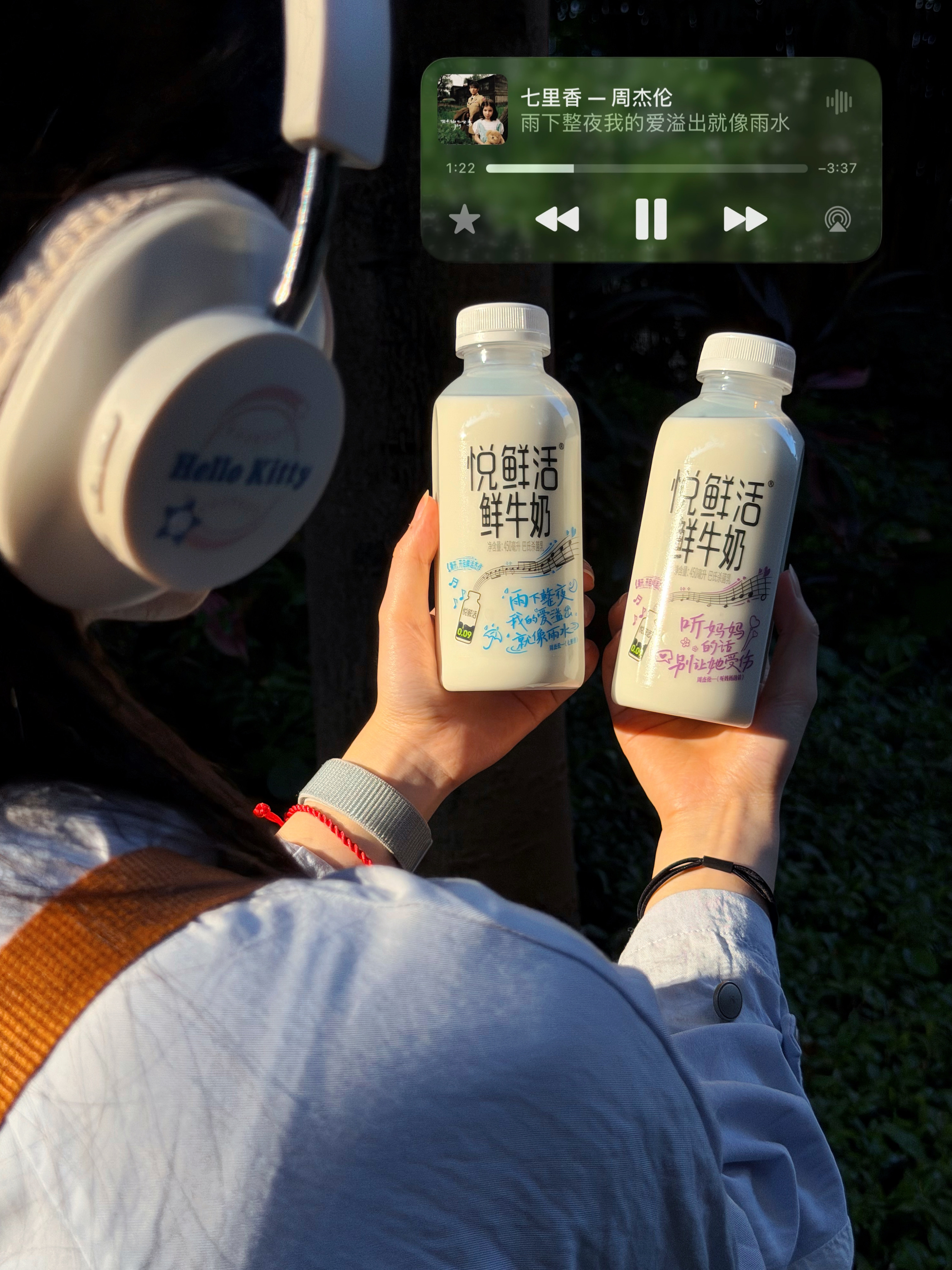 会唱歌的鲜奶真的来了!谁能想到悦鲜活的奶瓶居然自带BGM!藏在标签下的歌词真的像彩蛋一样惊喜,一撕开标签我的DNA就动了,周杰伦的声音就在脑海里自动播放——是《晴天》前奏响起的心动,是《七里香》夏天的味道......是刻进青春的旋律啊!这哪是奶瓶,分明是时光机✨