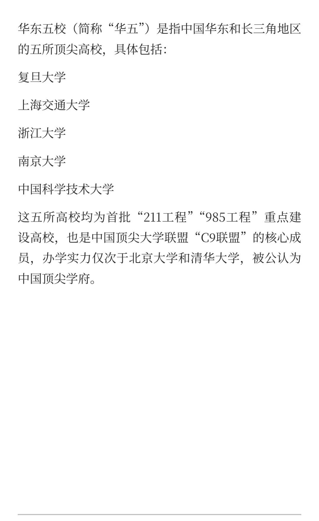 华五谁才是扛把子 华东五校,简称“华五”,包括复旦大学、上海交通大学、浙江大学、南京大学和中国科学技术大学,均为首批“211”“985”重点高校,是“C9联盟”的核心成员,办学实力仅次于北大清华,被誉为顶尖学府。 上海交通大学 复旦大学 名校 世界大学排名 报志愿选专业 高考