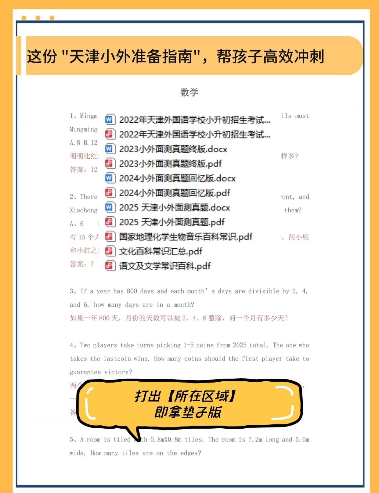 天津小外备考时间规划,按现有水平分档规划 🙋备考时间规划(按现有水平分档) 1️⃣短期备考(1 个月足够):适合已有高基础的学生🎯,数学熟练掌握小学四 - 六年级奥数且学过初中内容”。 2️⃣中长期备考(3-4 年):适合四年级、五年级 “备考小白”💪,核心目标是提升基础:英语需构建知识框架并达到高中水平(满足小外录取要求);📝数学需学完小学四 - 六年级奥数,部分学生可进阶学习初中数学。 3️⃣六年级专项集训(1 年):无论前期基础如何,六年级需用 1 年时间进行总复习 + 小外专有题型训练🎉,目的是熟悉考试规律与题型,避免 “裸考”,确保以充分准备应对考试💯。 小升初 天津小外 分享你家的小升初准备吧 天津小外 小学英语 六年级英语上册 学习规划 备考攻略 奥数