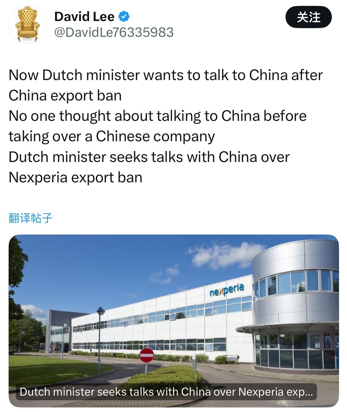 荷兰经济事务大臣卡雷曼思周日(19日)表明,他预计将在未来几天内与中国政府官员会面,讨论如何解决围绕计算机芯片制造商安世半导体(Nexperia)的僵局。还狂妄地称,中国汽车制造商也需要Nexperia的芯片,我们之间存在着相互依存的关系。 荷兰经济大臣卡雷曼斯正计划与中方官员见个面,想聊聊那个让大家头疼的安世半导体僵局,事情的导火索其实很清楚,就在9月30日,荷兰政府直接下场,接管了安世半导体,要命的是,这家公司虽身在荷兰,但背后却是中国的闻泰科技,这下子算是捅了马蜂窝,北京方面的反应来得又快又狠,直接禁止安世的产品出口。 千万别小瞧这家公司,它生产的芯片虽然不是什么顶尖货色,但却是汽车里必不可少的基础元件,产量巨大,荷兰这么一搞,中国的反制一出,全球的汽车巨头们立马就坐不住了,生怕供应链随时断掉,眼看就要搅动整个行业。 这事最拧巴的地方在于,双方讲的根本是两个版本的故事,在荷兰这边,卡雷曼斯在电视节目上苦口婆心地解释,说政府出手是为了防止公司的前任CEO把技术和资产弄出欧洲,是在维护“经济安全”,还特意撇清说“我们不是在帮美国”。 可在中国听到的,就是另一个味儿了,连荷兰自己都不得不承认,北京就认定他们是在和美国唱双簧,而在网络舆论场上,这种行为更被直接定性为“明抢”,很多人觉得根本没必要讲什么仁义道德,就得硬碰硬。 于是一头还在呼吁“我们有共同利益,得携手解决”,另一头却认为“只有把你打痛了,谈判才有意义”,这种南辕北辙的认知,让对话的基础从何谈起? 安世半导体事件最值得咂摸的,就是它把“相互依存”这个概念的脆弱性给扒了个底朝天,你看安世的供应链:芯片在德国汉堡生产,然后送到中国封装,这本该是全球协作的美好典范。 卡雷曼斯拿来当谈判筹码的也正是这一点,他反复强调“你们中国的汽车制造商也需要我们的芯片”,试图把这种依赖关系当成化解矛盾的桥梁。 然而现实却狠狠地开了一个玩笑,这种依赖恰恰成了对方手里最致命的武器,中国的出口禁令,就是精准地卡在了这个需要中国完成的“封装”环节上,这种思路在民间更是被发扬光大,有人提出,荷兰对中国的依赖多着呢,花卉、乳制品、阿姆斯特丹港的物流……哪儿都是可以敲打的靶子。 所以说安世的风波远不只是一场商业纠纷,它告诉世界,在如今这场技术竞争的大棋局里,那些曾经将大家紧密联系在一起的经济纽带,也可能在瞬间变成勒住彼此喉咙的绳索,未来的高层磋商要解决的,恐怕已不仅仅是眼前的僵局,而是一个更根本的问题:在一个信任日益稀薄的世界里,我们该如何重新定义彼此之间这种“你中有我、我中有你”的复杂关系。 以上信息来源于新浪财经 牛弹琴:荷兰被骂惨了