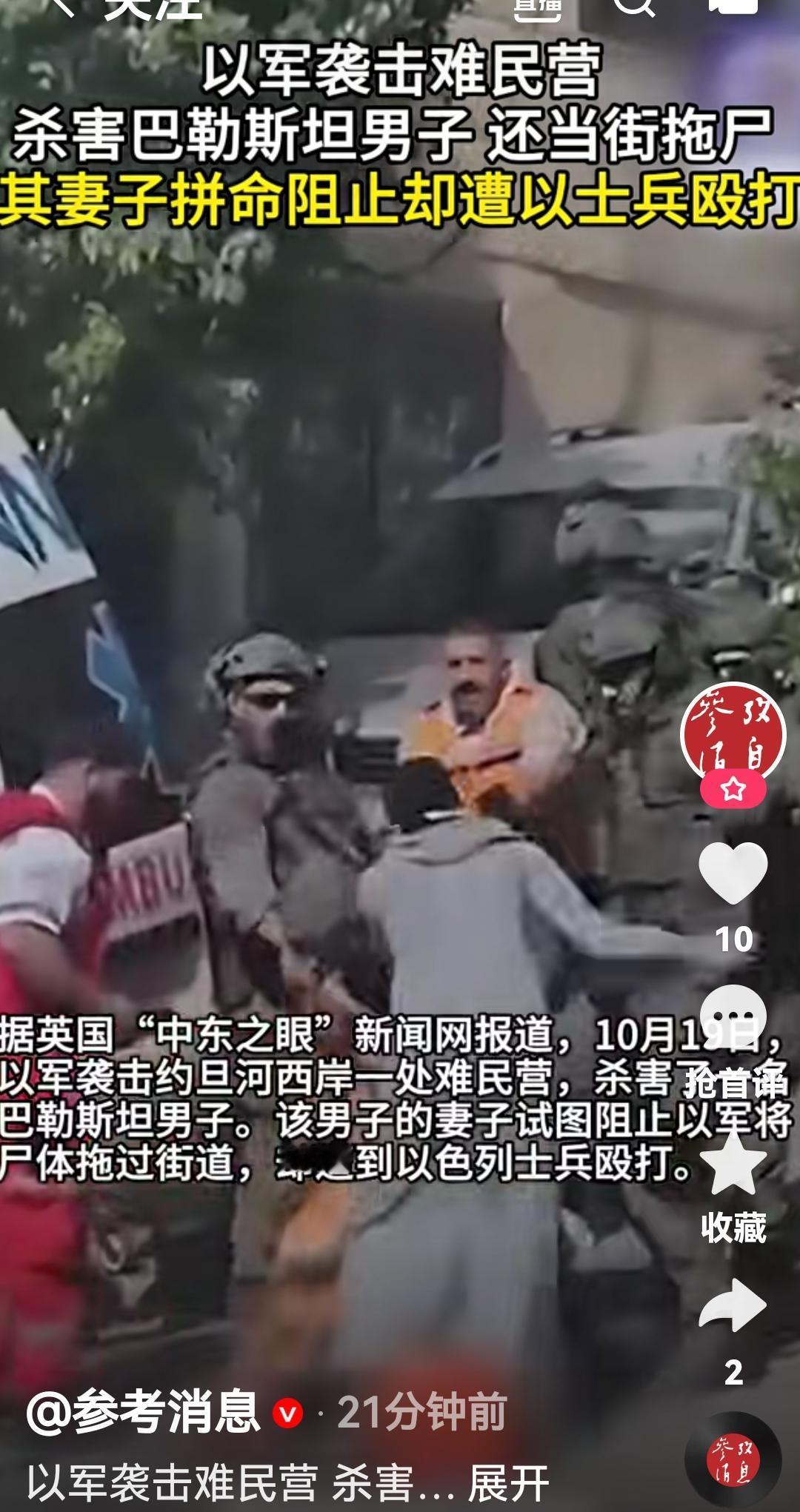 以色列军队再次袭击难民营,杀害一名巴勒斯坦男子 根据英国媒体报道,10月19日以色列军队袭击了约旦河西岸一处难民营,杀害一名巴勒斯坦男子,并将该男子尸体当街拖拽,该男子妻子试图组织这样行为,但是以色列军人当街殴打该女子 看来加沙很难停火了,关键现在还没有人有能力反抗了现在情况更麻烦,因为有一部分人居民回到原来地方巴勒斯坦国 以色列边境局势 巴勒斯坦反战 图片来自参考消息视频