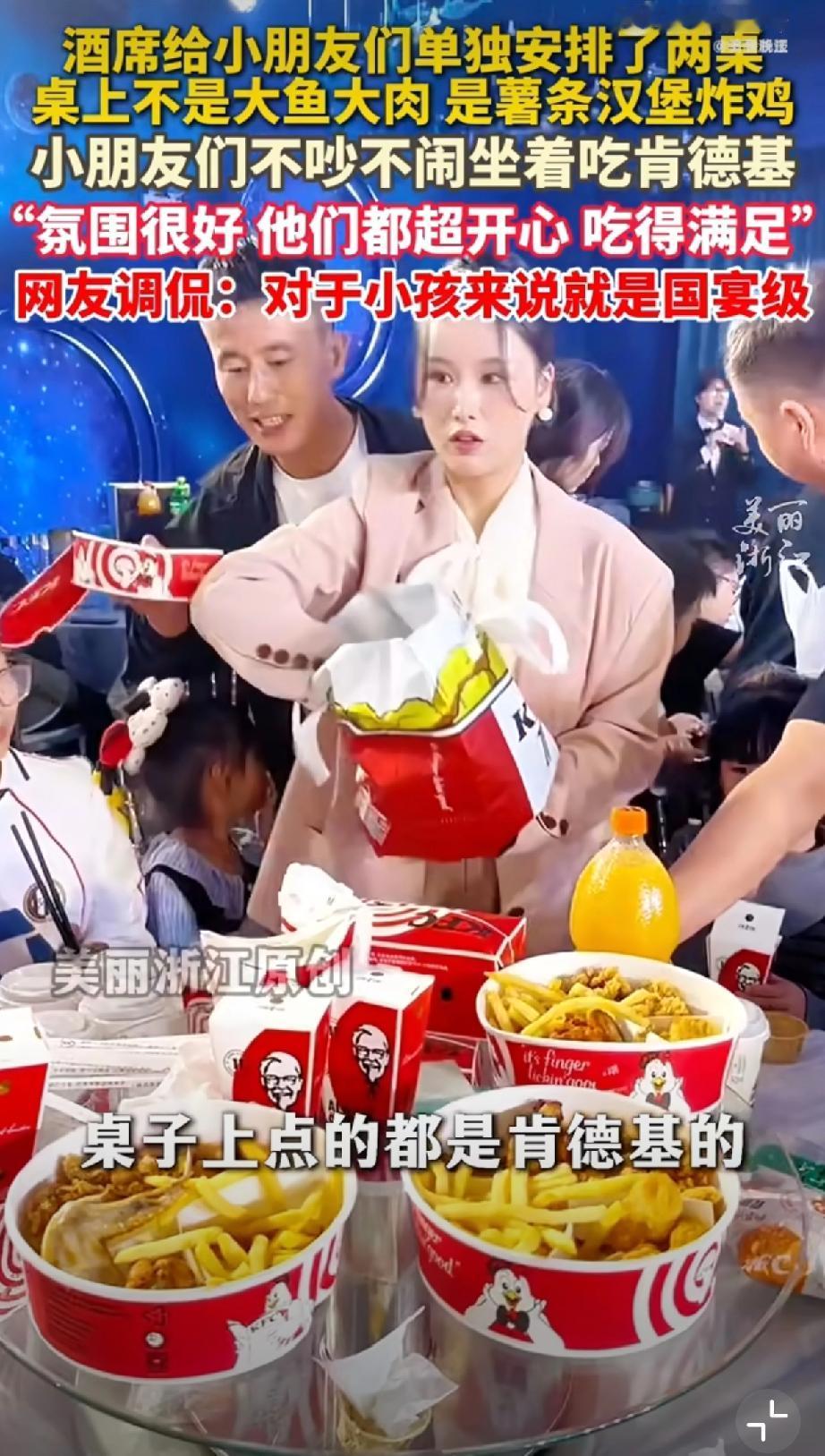 最近安徽一场生日宴上了热搜,主人特意给小孩单独安排了两桌肯德基炸鸡薯条,结果孩子们全程埋头认真吃饭,场面又乖又欢乐。 拍视频的胡先生说,这么安排就是怕传统酒席菜不合孩子胃口,没想到效果出奇地好。 这事儿在网上讨论度特别高,好多家长直呼“太懂孩子了”。 平时宴席上小孩坐不住、挑食闹腾的情况不少,这一招直接解决了大人吃饭时的头疼问题。 有人开玩笑说,这简直是“童年顶配待遇”,甚至建议以后酒席都推广儿童专属菜单。 其实仔细想想,这种安排背后挺有意思的。传统中式宴席讲究大鱼大肉,但孩子们可能真不买账。 现在主人能主动细分需求,既让小孩吃得开心,又不打扰大人社交,算是宴席文化的一种贴心升级。 而且西式快餐和中式酒席的混搭,反而碰撞出一种真实的生活智慧——尊重实际需求比固守形式更重要。
