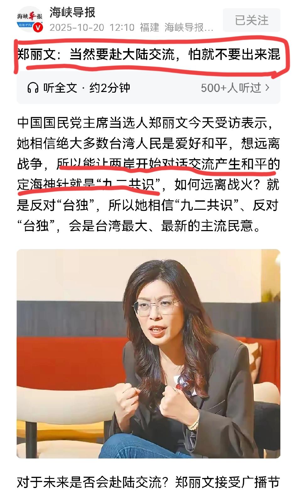 郑丽文和马英九、朱立伦是一样的人。在接受媒体采访时,媒体问她是否支持两岸统一。她没有直接回答,而是模糊发言,只说统一一定要两岸民众都高高兴兴,完全同意,目前更重要的是加强两岸交流。所以,我断定郑丽文和马英九、朱立伦是一脉相承,只谈交流,只要红利,期望她在推动国家和平统一方面做出实质性动作很难。当然目前台湾省的国民党是在野党,只有赢得2026大选,她才能主政台湾省,才能做些事情。就目前而言,如果她能够主政台湾省,能够和平发展共同进步,比现在的赖清德之流好多了。