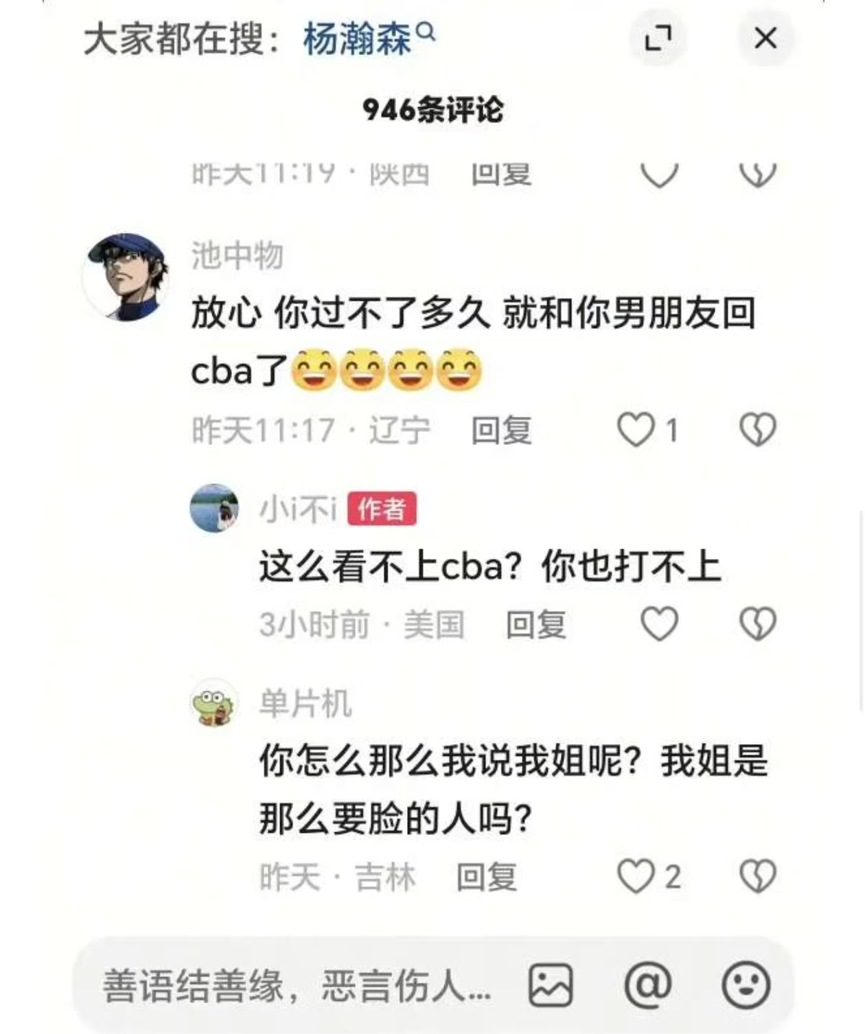 杨瀚森今年被NBA开拓者选中,让他的关注点越来越高,中国已经很久没有球员能够被NBA首轮选中了,所以很多球迷都对他期望非常大,不过这些球迷当中也有很多比较极端的。杨瀚森现在一举一动都会被放大,他的私生活也被曝光,杨瀚森女朋友现在是在美国跟他一起,每当杨瀚森表现不好的时候,杨瀚森带着女朋友在国外的话题就会被提起,一些网友也是爹味十足,跑到杨瀚森女朋友社交媒体下面评论。