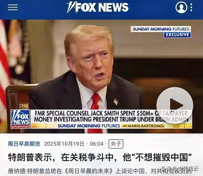 特朗普言论! 我不想摧毁中国,他用威胁乌克兰的方式对中国恐吓,这种行为行不通。 10月19日,特朗普接受他最喜欢的福克斯新闻的采访时,他再一次提到中国,特别是与中国关税战的未来。 特朗普这次依然和以前一样,说话漫无边际,甚至口出狂言,当然说的很多问题与现实不符。 比如提到在上一个总统任期内,他用关税战让中国付出了数千亿美元,还说如今中方被迫让美国对他们收取155%的关税,中国因为美国而扩充军队等等。让人觉得特朗普的表态莫名其妙。 特朗普甚至威胁说:“我不想摧毁中国。 这位前总统的言论总带着戏剧性的摇摆。一边声称不愿摧毁中国,一边又挥舞关税大棒,仿佛国际关系是场街头谈判。他的逻辑让人想起马戏团的杂耍演员——动作眼花缭乱,却始终在原地打转。 关税战的真相究竟如何?根据彼得森国际经济研究所数据,美国对华加征关税的90%实际上由美方企业和消费者承担。那些所谓的“数千亿美元”更像从自家口袋掏钱,却硬要说是战利品。 他把中国军力扩张归咎于美国,这倒暴露了认知错位。中国国防建设始终遵循防御性国策,这点在白皮书中写得明明白白。将正常国防发展与外部威胁强行挂钩,未免太过自作多情。 乌克兰危机的类比更是危险至极。中国不是乌克兰,中华民族有足够智慧辨别虚张声势与真实威胁。用地缘博弈的旧剧本来应对东方大国,好比用弓箭瞄准卫星般荒诞。 还记得2019年关税战最激烈时吗?美国中西部农场主看着堆积如山的大豆夜不能寐。贸易逆差不但没缩小,反而在2022年创下历史新高。这种杀敌八百自损一千的招数,竟被当作功绩反复炫耀。 观察特朗普的发言规律会发现,每当选举临近,中国话题就会成为他的提词器。这次抛出155%的惊人关税,不过是为竞选集会预热造势。真实性与可行性从来不在他的考虑范围。 国际关系不是真人秀,国家命运不能寄托在即兴表演上。从“退群”世卫到撕毁伊核协议,这种交易式外交早已让世界警惕。如今想把亚太地区变成新的真人秀舞台,观众们可都睁大了眼睛。 中国回应的方式始终清晰——坚定扩大开放、深化多边合作。进博会即将迎来第六届,展商名单长度年创新高。这就是对单边主义最有力的回答,用行动代替争辩,以发展破解围堵。 那位商人总统或许忘了,经济全球化是江河奔流,不是儿童沙盘。强行筑坝只能让水流改道,终将冲刷出新的航道。华为Mate60的突破已经证明,创新之火从来不怕风口变动。 当恐吓沦为例行公事,其威力便消散于无形。就像《狼来了》的寓言,重复的虚张声势最终会反噬可信度。世界格局的棋局上,中国早已走出自己的定式。 各位读者你们怎么看?欢迎在评论区讨论。