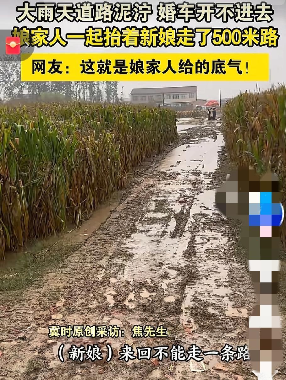 河南商丘这姑娘出嫁,一场大雨直接把婚车堵在500米外的苞米地,这婚还咋接呢?结果