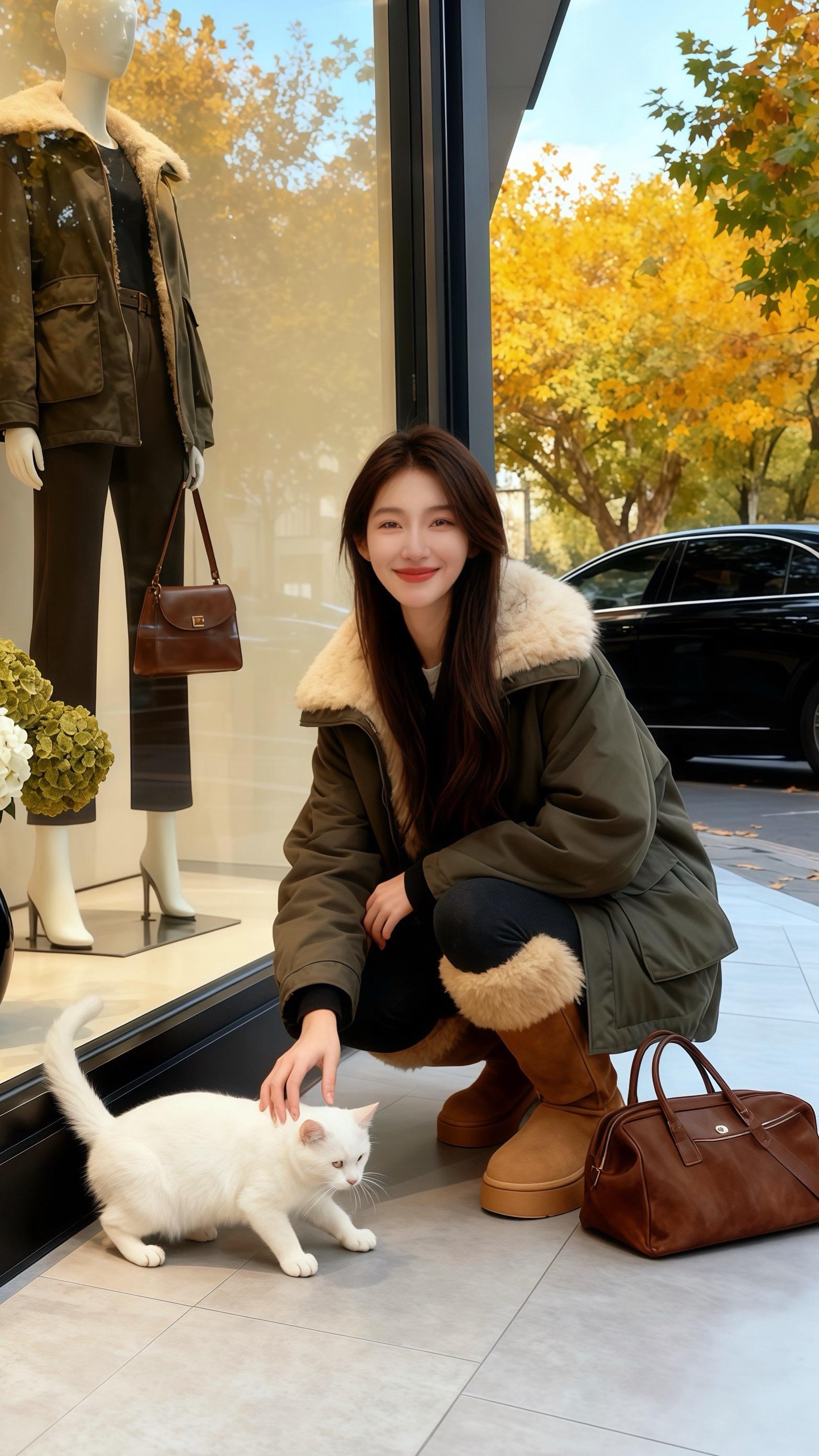 深秋的梧桐道上,林晚穿着军绿色毛绒领工装外套,搭配同色系厚底毛绒长靴,挎着棕色托特包,在自家服饰店橱窗前驻足。她本想拍组穿搭分享,却被橱窗里的同款“模特”勾起兴致。