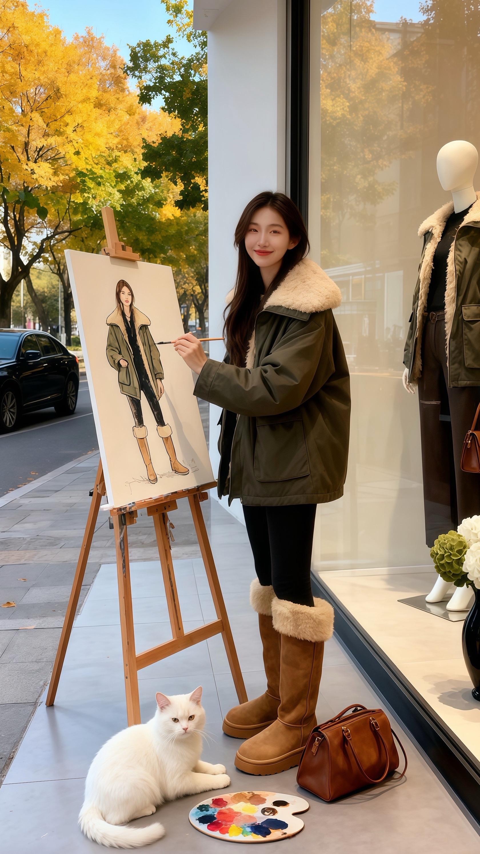 《秋日穿搭博主的“意外灵感”:当穿搭撞上猫咪与画笔》