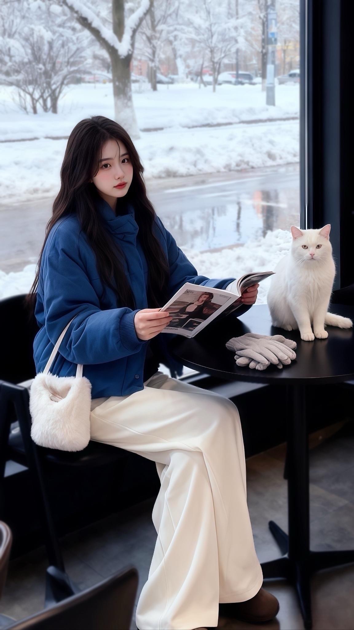 后来在靠窗的位置,她翻着时尚杂志,奶白色毛绒包往臂弯一搭,暖棕雪地靴踩得安稳。窗外雪还在下,店里猫咪跳上桌面,她低头的瞬间,被邻桌客