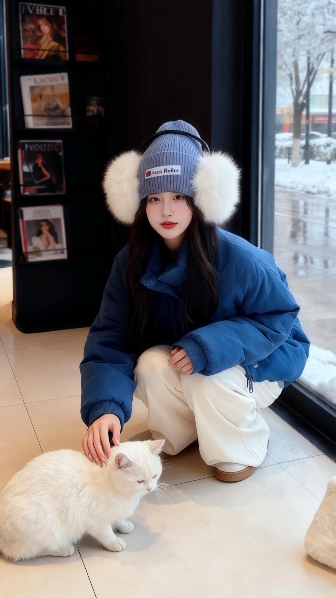 转场到猫咖,她换上带毛球的针织帽,指尖抚过白猫的软毛,蓝与白的搭配和窗外雪景莫名契合。邻座小姐姐盯着她的穿搭,偷偷打开了购物软件。