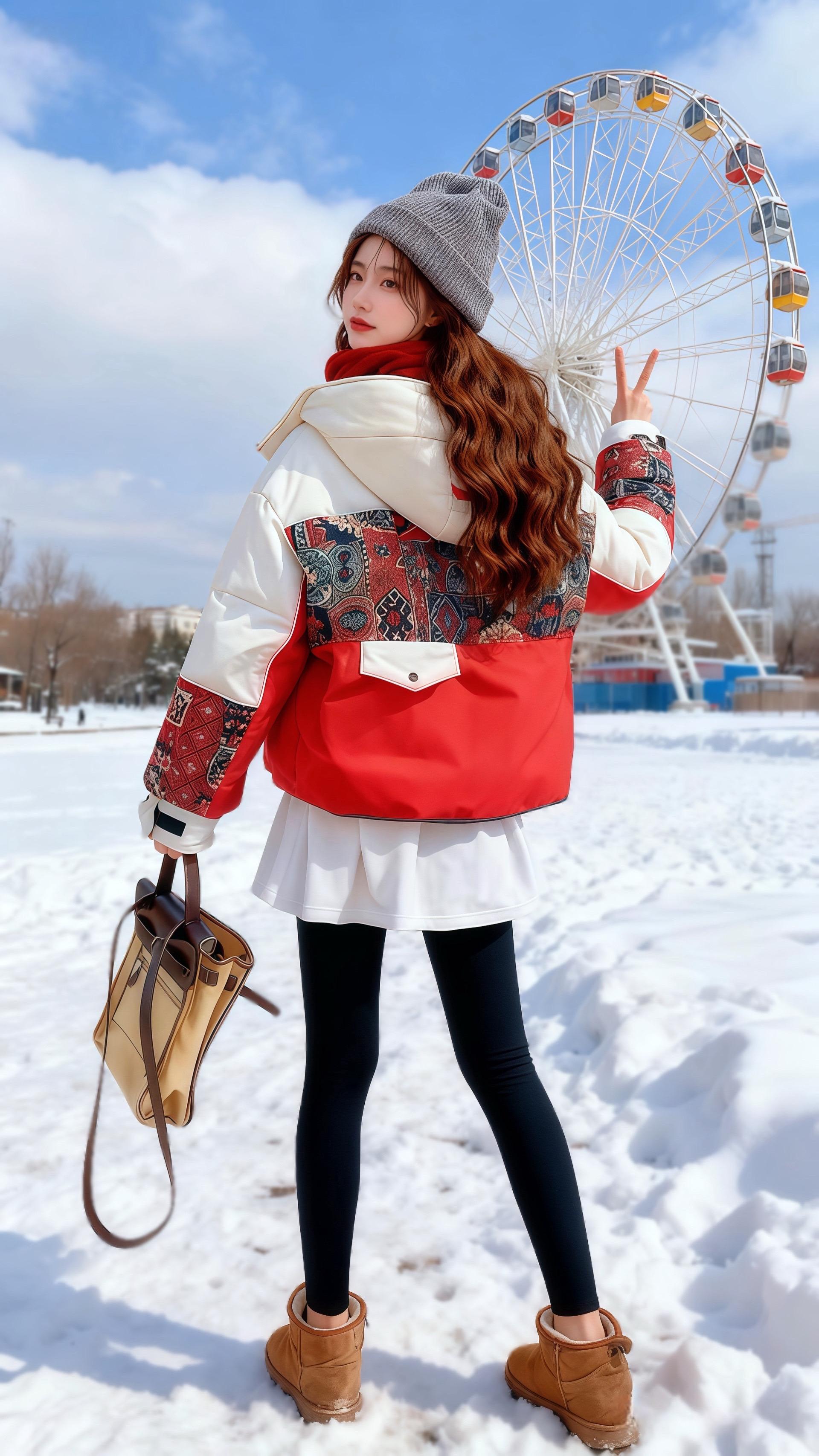 当她转身对摩天轮比耶,驼色雪地靴踩碎雪粒,那刻,国潮的飒与少女的甜完美融