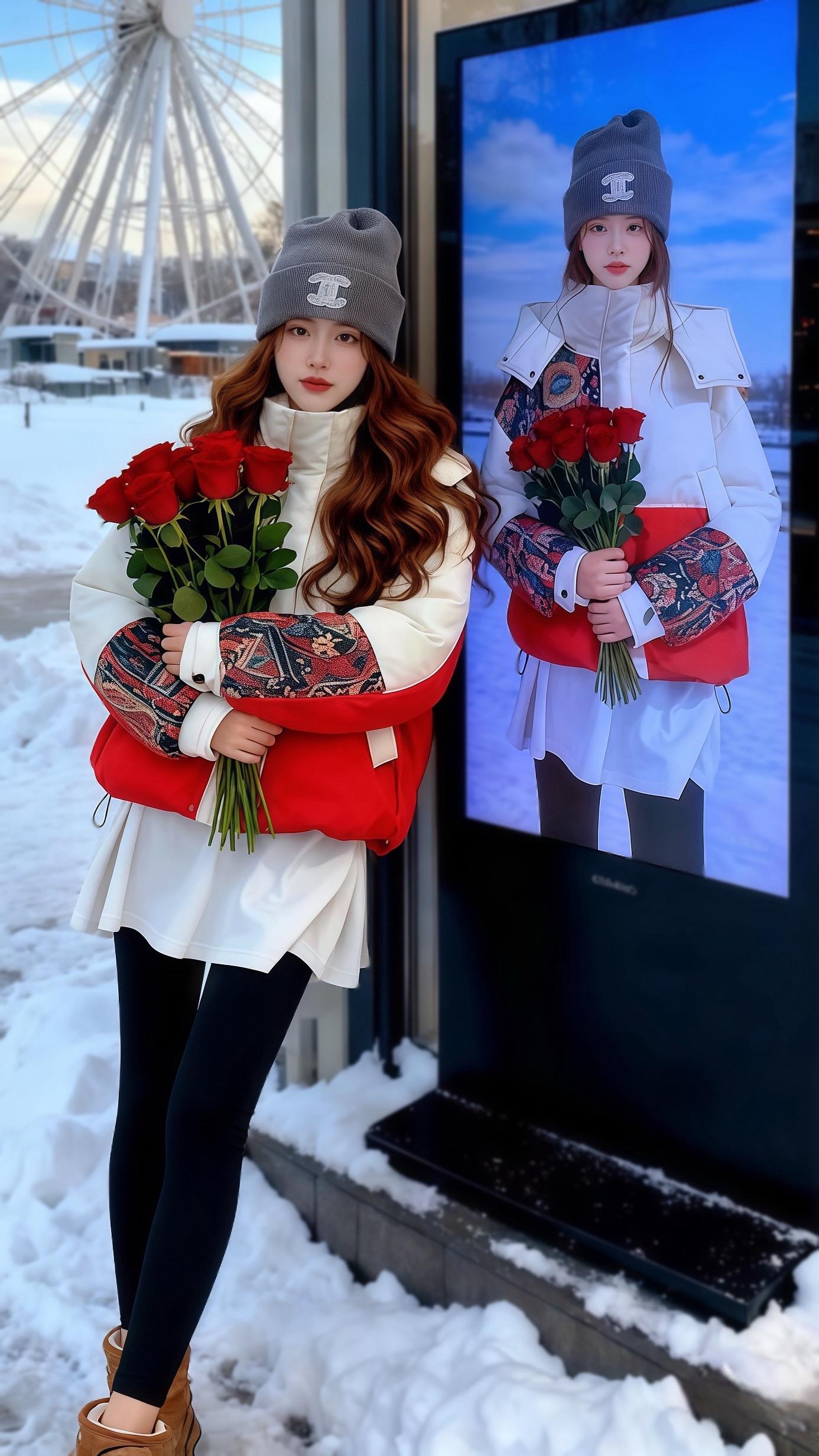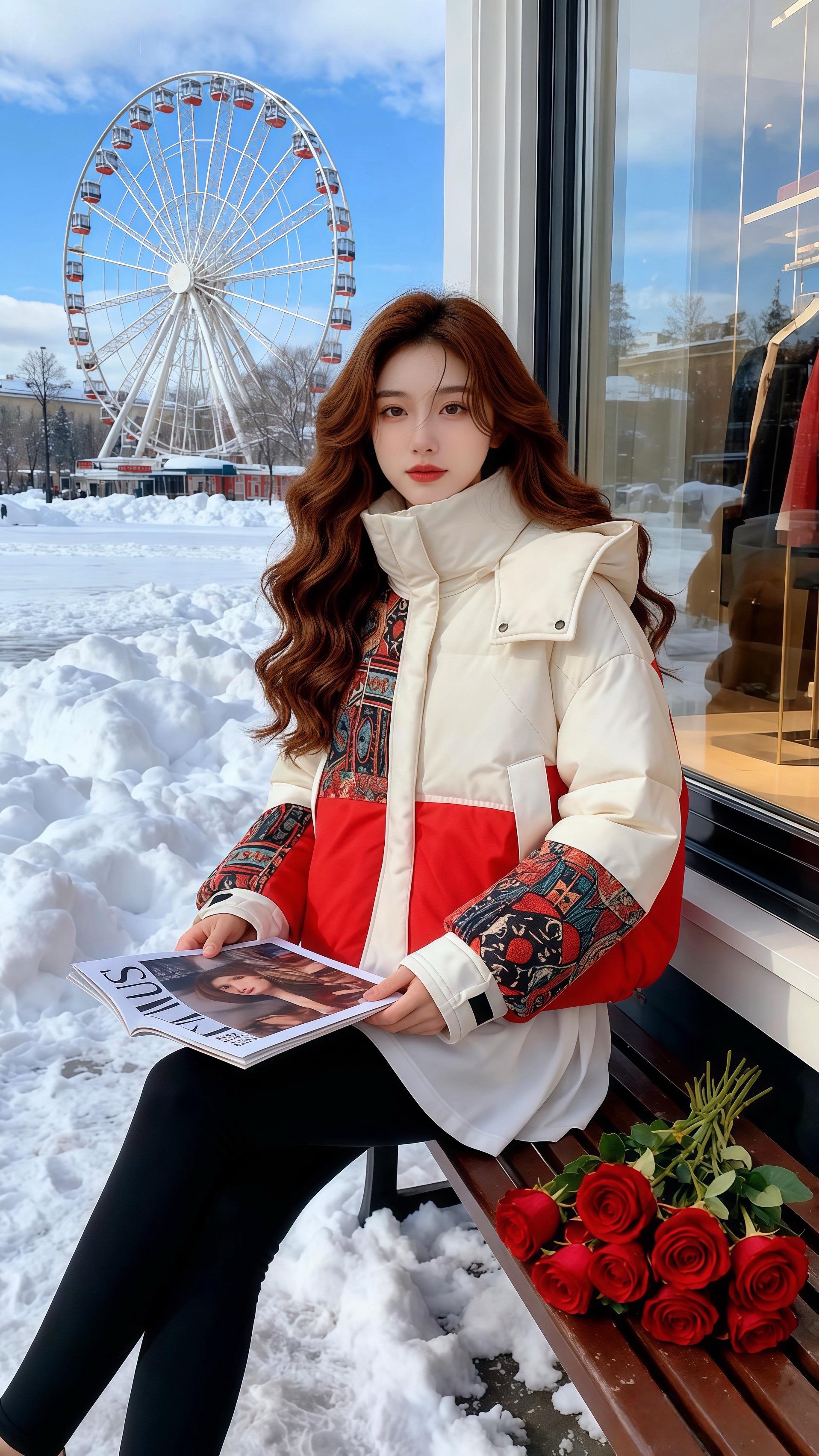 灰色针织帽衬得她眉眼灵动,羽绒服上的传统纹样在雪光里愈发精致,像把敦煌壁画穿在了身上。在橱窗边,她指着同款“战袍”,眼里闪着雀跃的光;长椅上翻看杂志时,衣摆的层次又添了几分柔;捧着红玫瑰站在大屏前,与镜中自己“撞衫”的瞬间,浪漫值拉满;就连在雪人旁接雪花,红围巾与红羽绒的呼应,都让这冬日多了层暖意。