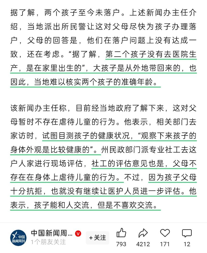我不停地刷着微博,一直在等官方发一张野人小孩在医院体检的照片,他将穿上衣服,体检报告要写着,身体发育正常,脊柱发育正常,智力发育正常,生活常识能力正常,语言沟通能力正常,与同龄小孩相比较一切正常。但我目前还没有等到,我希望有那一天。[摊手][摊手]