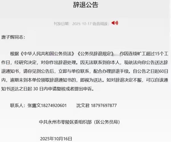 永州连发两个公务员辞退公告,郑翔、唐子辉因为旷工十五天而被辞退,在现在就业竞争激