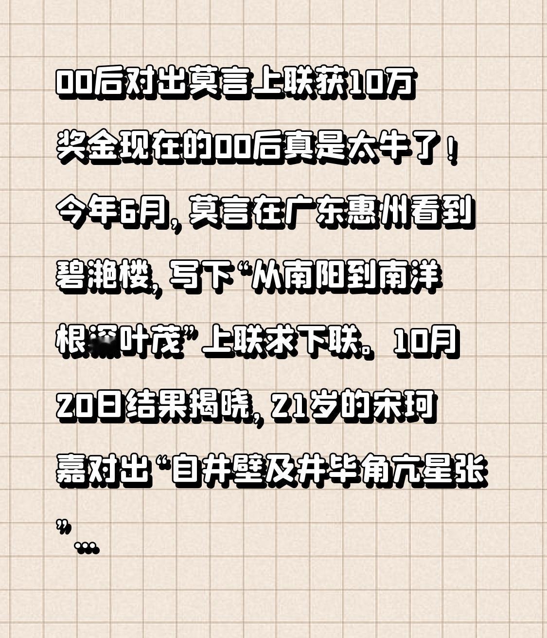 00后对出莫言上联获10万奖金 现在的00后真是太牛了!今年6月,莫言在广东惠州看到碧滟楼,写下“从南阳到南洋根深叶茂”上联求下联。10月20日结果揭晓,21岁的宋珂嘉对出“自井壁及井毕角亢星张”,独得10万奖金。北师大教授欧阳江河都称赞这是“多年难遇的绝对”。 宋珂嘉没亲自领奖,由妈妈代领。更让人敬佩的是,他要把一半奖金捐给“莫言同心”公益项目救先心病儿童。这00后小伙有才又有品,用才华赢巨额奖金,还不忘回馈社会,未来可期啊!