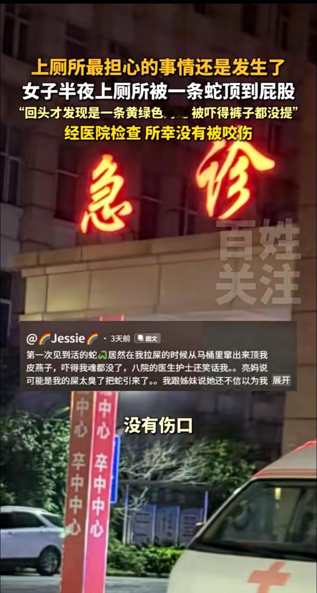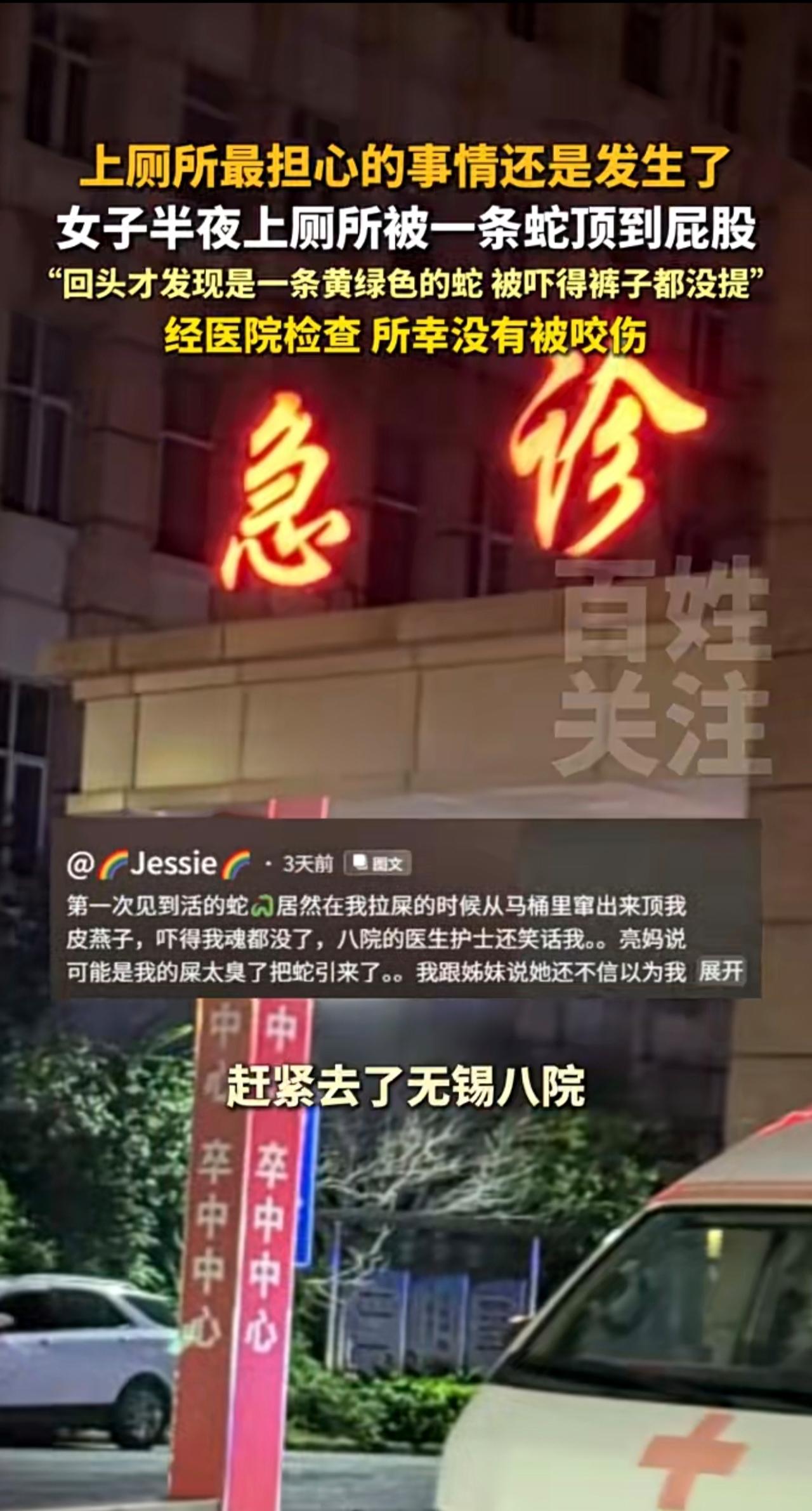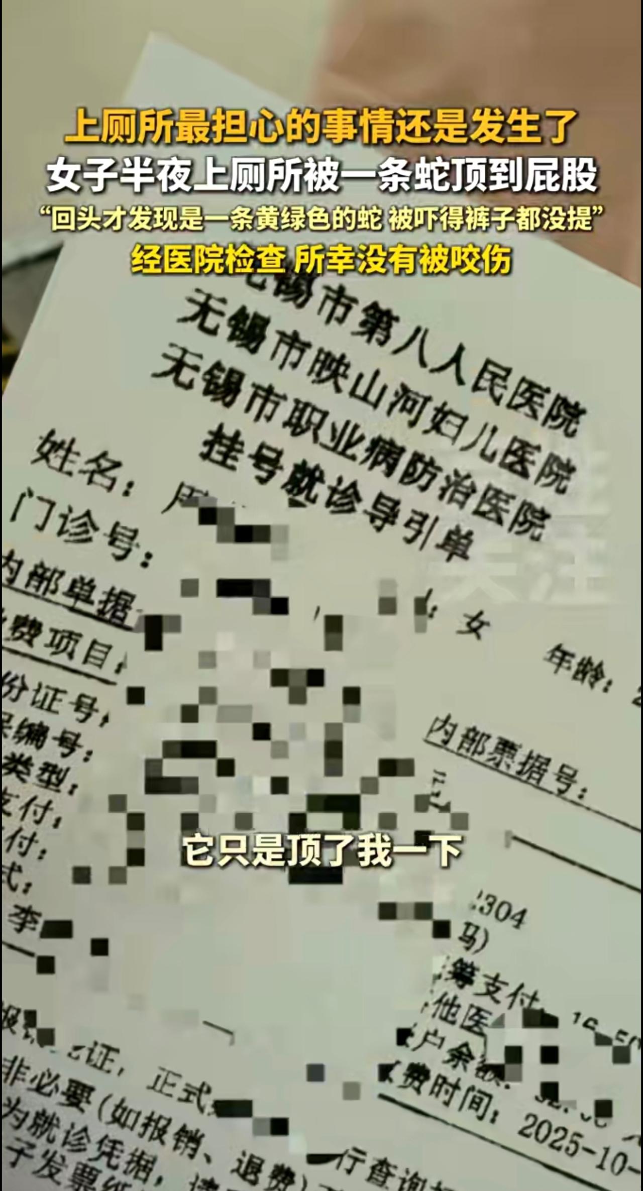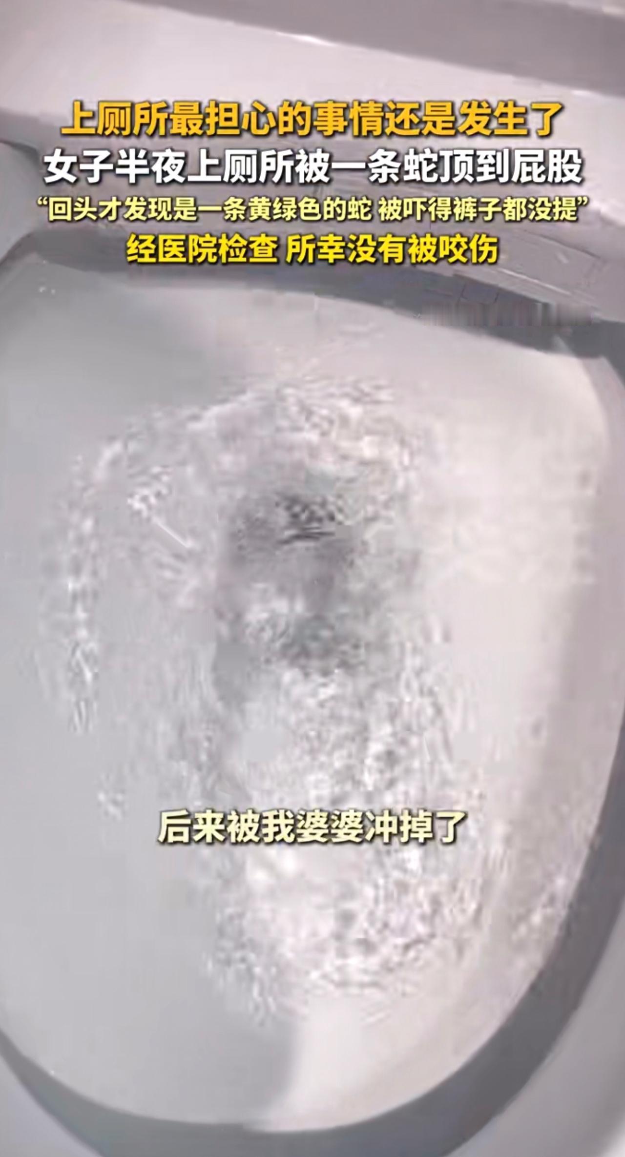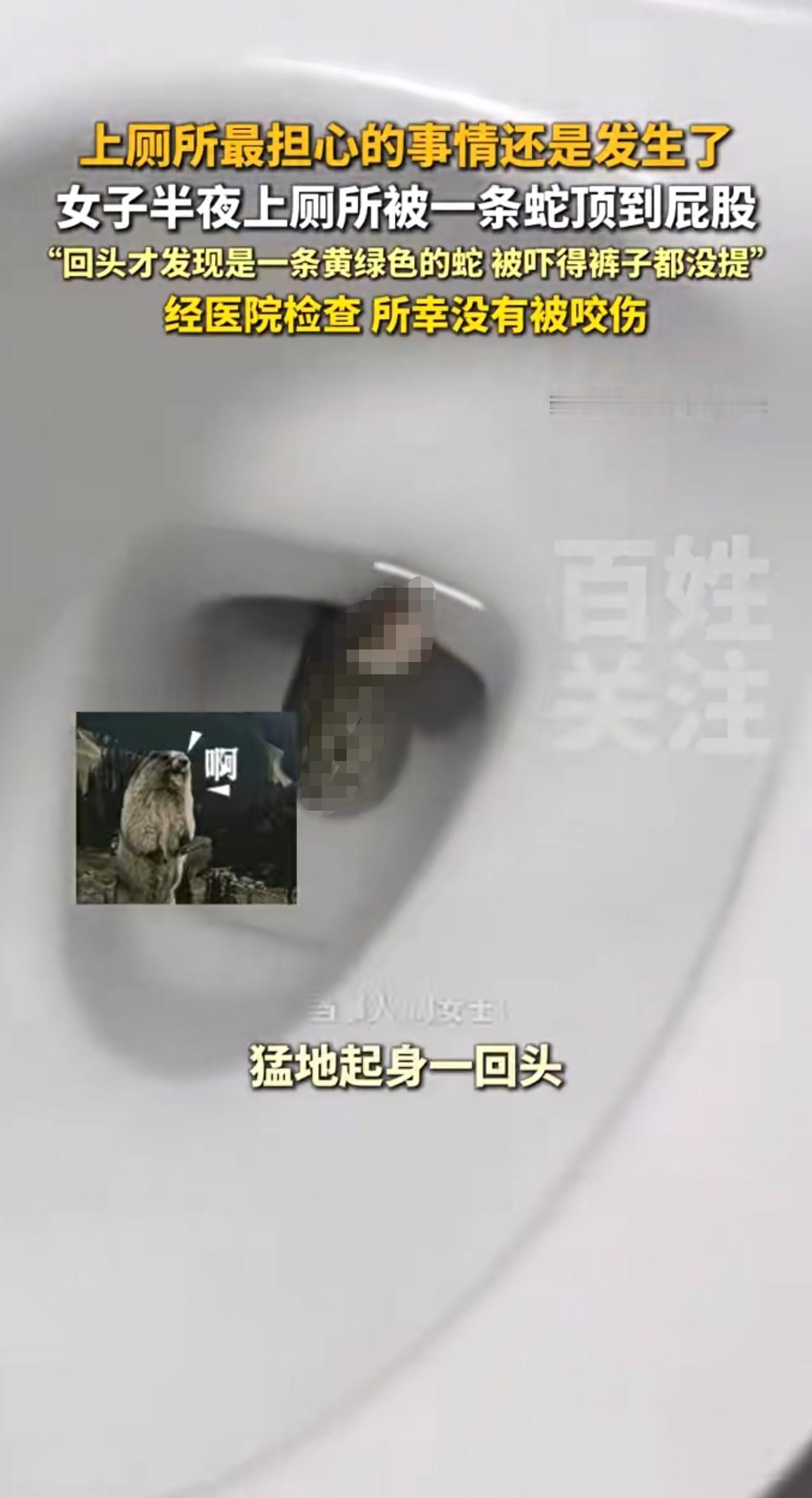 吓人!一女子半夜上厕所被一条蛇顶到屁股,吓得裤子都没穿。(出镜:刘畅;编辑:黎晓彤;责编:周志钊;来源:钱江视频、无锡博报) 老百姓关心的话题 热点 措不及防