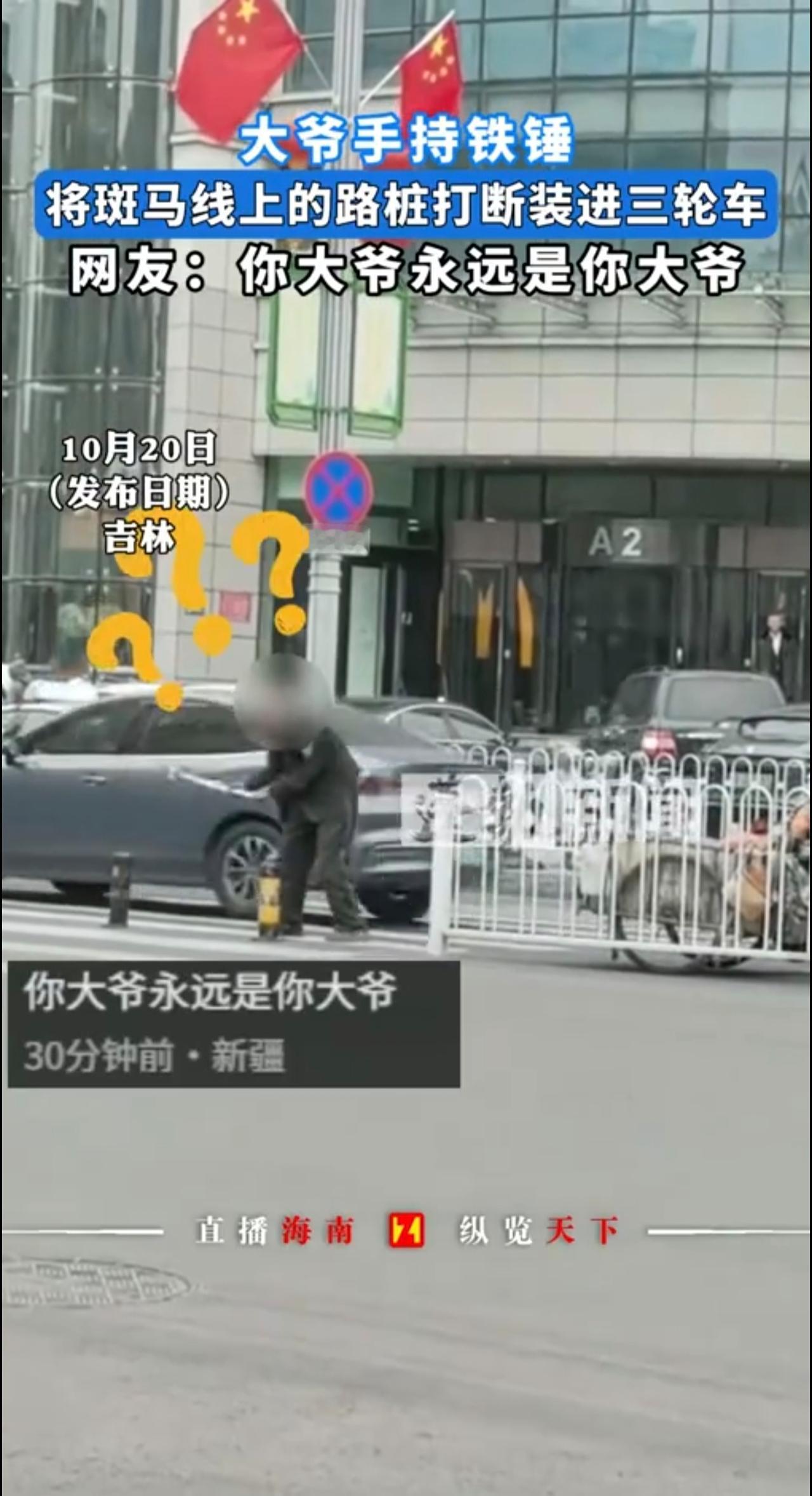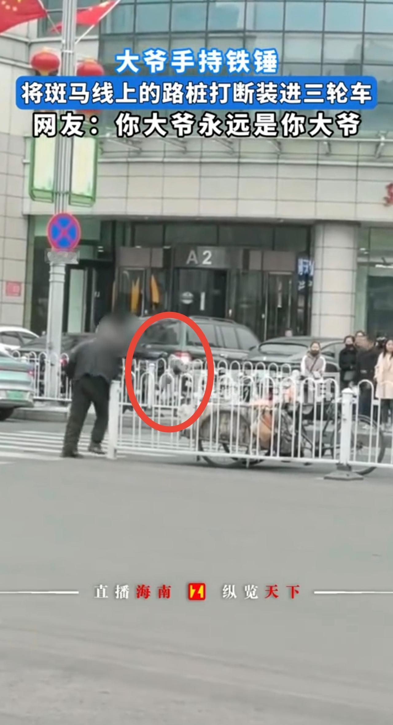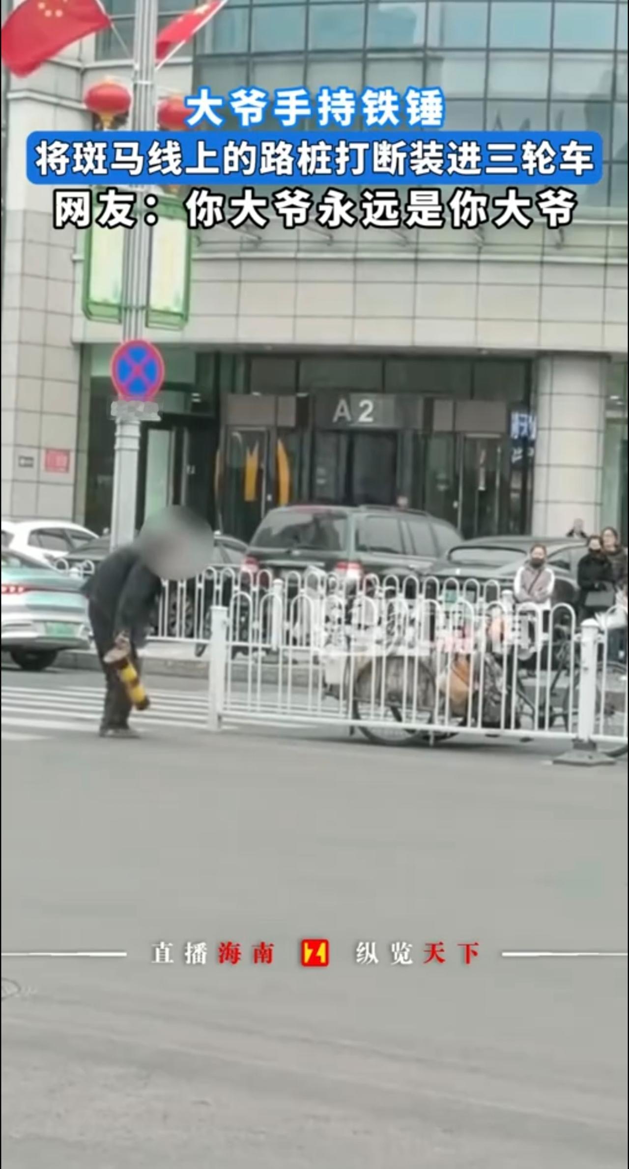 大爷手持铁锤,将斑马线上的路桩打断装进三轮车 网友:你大爷还是你大爷[捂脸]