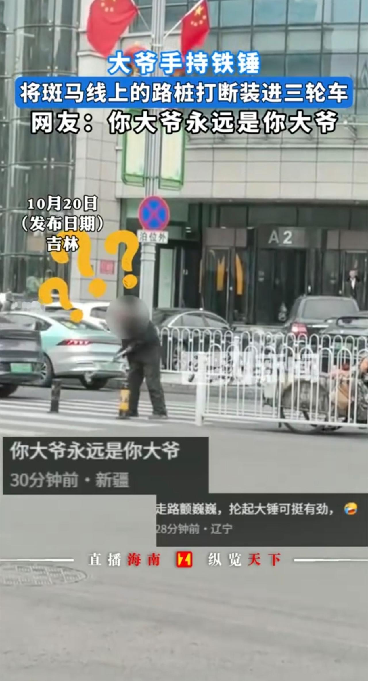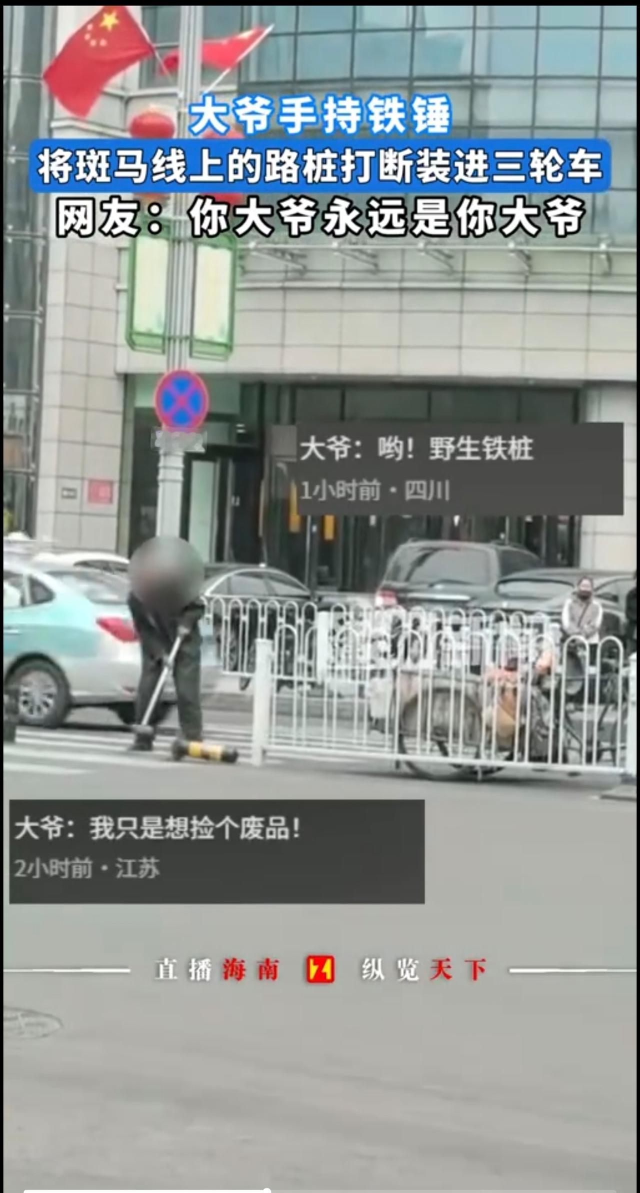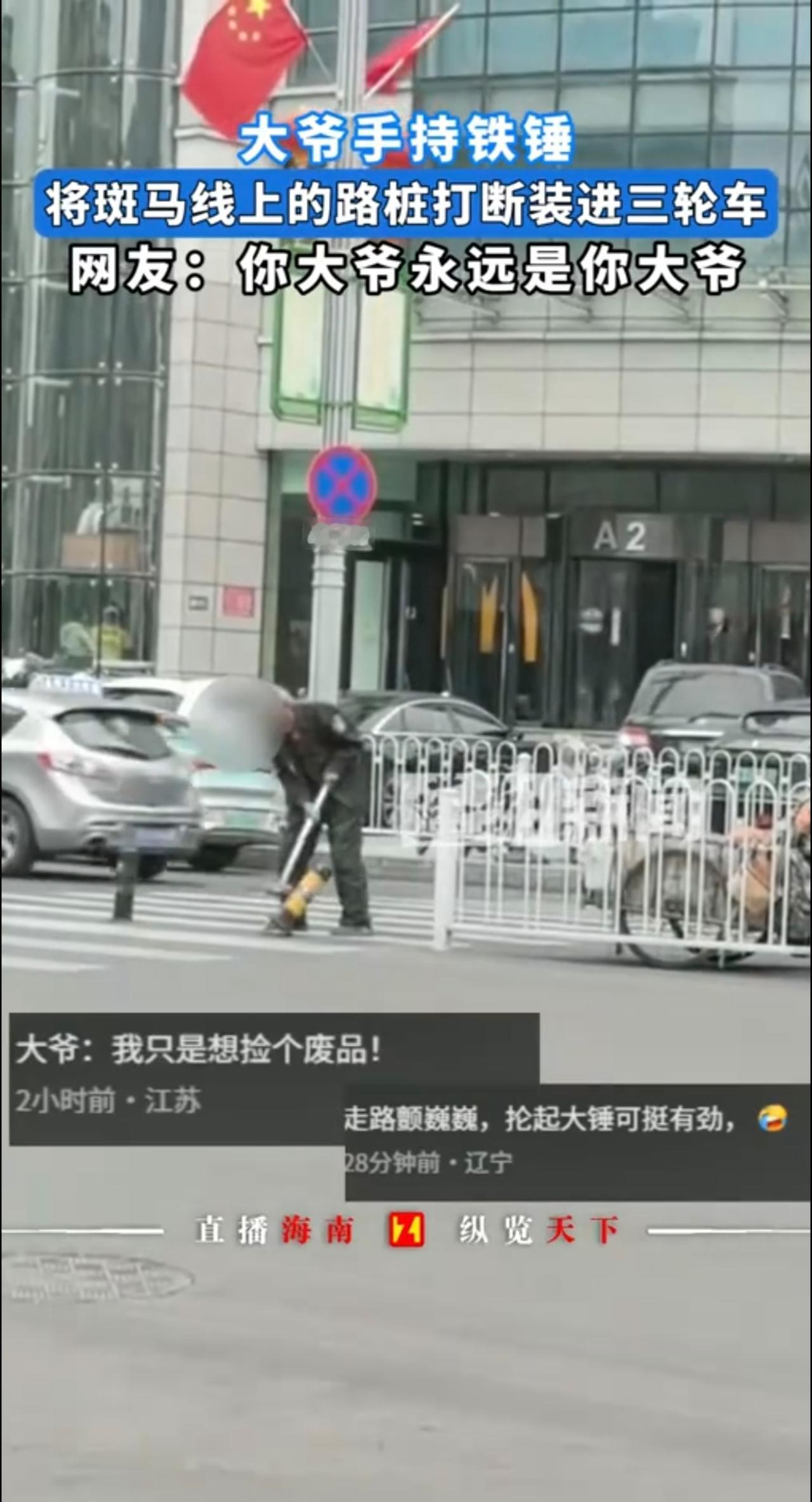 大爷手持铁锤,将斑马线上的路桩打断装进三轮车 网友:你大爷还是你大爷[捂脸]