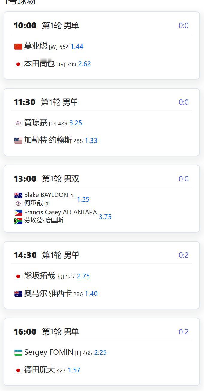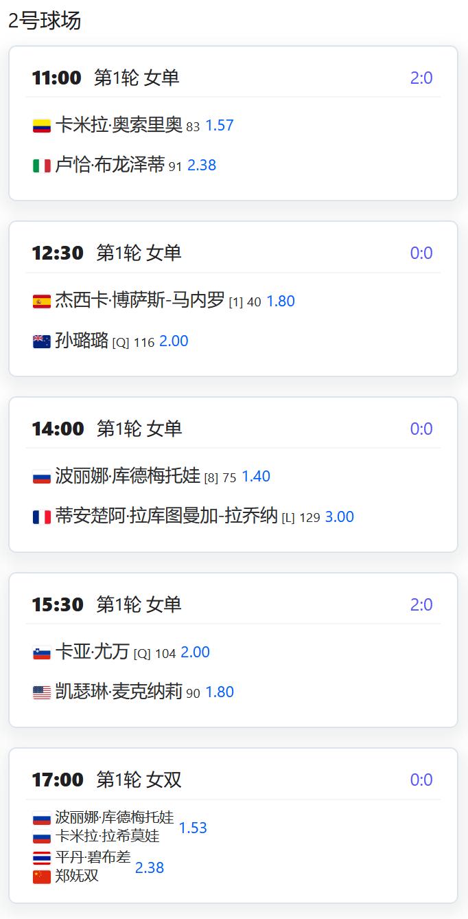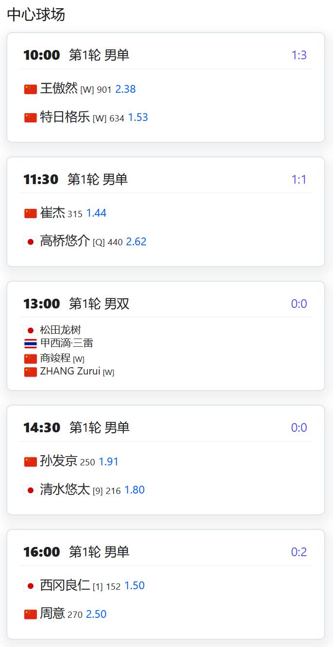 今日赛程: WTA250赛广州站,女单第一轮,持外卡参赛的郭涵煜将对阵邦达尔; 老将张帅将对阵扎哈罗娃; 女双第一轮,郑妩双/碧布差将对阵俄罗斯组合库德梅托娃/拉希莫娃; CH75宿州,男单第一轮,王傲然和特日格乐两位外卡球员将争夺一个晋级名额; 崔杰将对阵资格赛球员高桥悠介; 孙发京将对阵9号种子清水悠太; 周意将对阵头号种子西冈良仁; 莫业聪将对阵青少年球员本田尚也; 男双首轮,商竣程搭档张祖睿持外卡参赛,将对阵松田龙树/三雷的跨国组合。