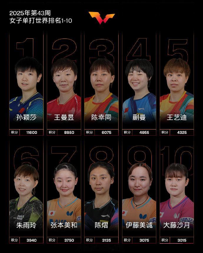 女子单打,中国队球员孙颖莎、王曼昱、陈幸同、蒯曼、王艺迪位列前五,陈熠位列第八。