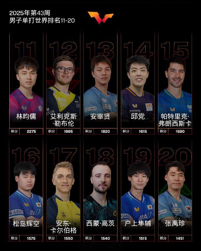 男子单打,中国队球员王楚钦、林诗栋位列前二,梁靖崑位列第七,向鹏位列第九。