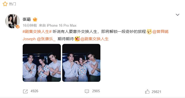 张萌助力宣传曾舜晞与张康乐的新剧《交换人生》,此外她还是这部由曾舜晞、张康乐主演剧集的制片人,两种角色体现出对剧集的推动。张萌宣传曾舜晞张康乐交换人生张萌是曾舜晞张康乐新剧制片人