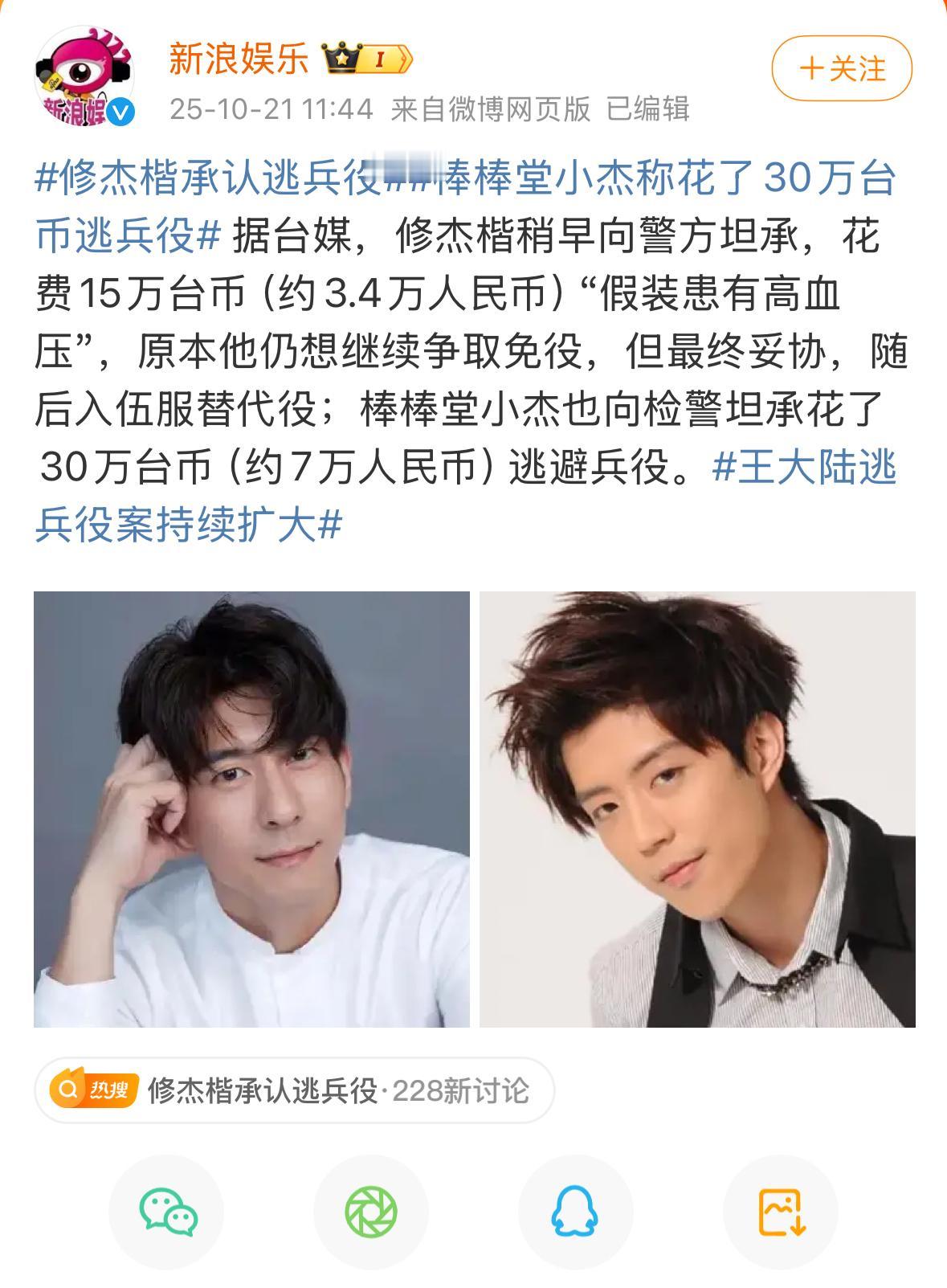 修杰楷承认逃兵役了‼️🤦♀️ 湾湾检调太没人情味🙅♀️ 一早到人家里直接上拷,也不顾孩子感受,差评👊 修杰楷争取无果,直接坦白承认花了15万台币,也就是3.4万人民币左右逃避兵役,也承诺随后入伍服替兵役。贾静雯天要塌了🤦♀️ 台检这波操作都是王大陆手机惹的祸🤦♀️ 陈柏霖也被牵涉其中🫣 湾湾男艺人难道要团灭⁉️😂 以后有重要的事还是打电话说吧,別留聊天记录啦🥹🥹🥹 如何看待王大陆涉逃兵役被逮捕 修杰楷逃兵役