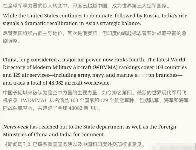 印度空军被排名世界第三! 欧美国家排名的最新空军实力,第一名美国,第二名俄罗斯,第三名印度,第四名中国,对此印度网民一片沸腾,认为这是印度空军的巨大胜利!你别管怎么样,印度网民是真的信了,你敢排名,印度人就敢信。其实印度执行的也是愚民教育,印度媒体发布什么,印度网民就信什么。 尤其是当印度看到国外媒体,把自己排成世界第三空军的时候,简直都要乐疯了。印度人是真的相信,他们就特别容易隐瞒,只要印度高层喊印度永远争第一,那么印度人民就可以很好被控制,这就是印度人民的可爱之处,不会去思索,只会去听上层的建议。 目前世界下,咱们中国有5代的歼20和歼35战机,还有6代的歼50和歼36战机,加上4代的歼10和歼16战机,以及多款4代机,在数量上是世界第二,但质量上,都是世界第一。但仍然被国外媒体排上了世界空军第四,这就代表了西方世界的偏见,到底有多么的大。 美国连6代机的影子都没出来。俄罗斯连5代机都没搞明白,印度甚至连5代机计划都没有,印度4代机还是买的法国和俄罗斯的战机,但印度仍然被排到了世界第三,你可见这个榜单,有多么的不靠谱。 博主也不想说什么,反正你们西方人怎么高兴怎么排,也可以看出了欧美人的傲慢和偏见,真的是落后于时代。真的有点像鸦片战争之前的大清,整天沉迷于天朝上国的美梦,看不到世界发展,最终欧美国家的美梦,肯定要是要被打醒的。
