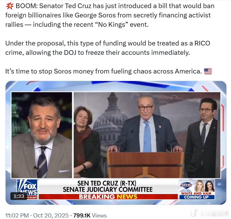 参议员特德·克鲁兹刚刚提出一项法案,旨在禁止像乔治·索罗斯这样的外国亿万富翁秘密资助激进分子的集会——包括最近的“No Kings”活动。