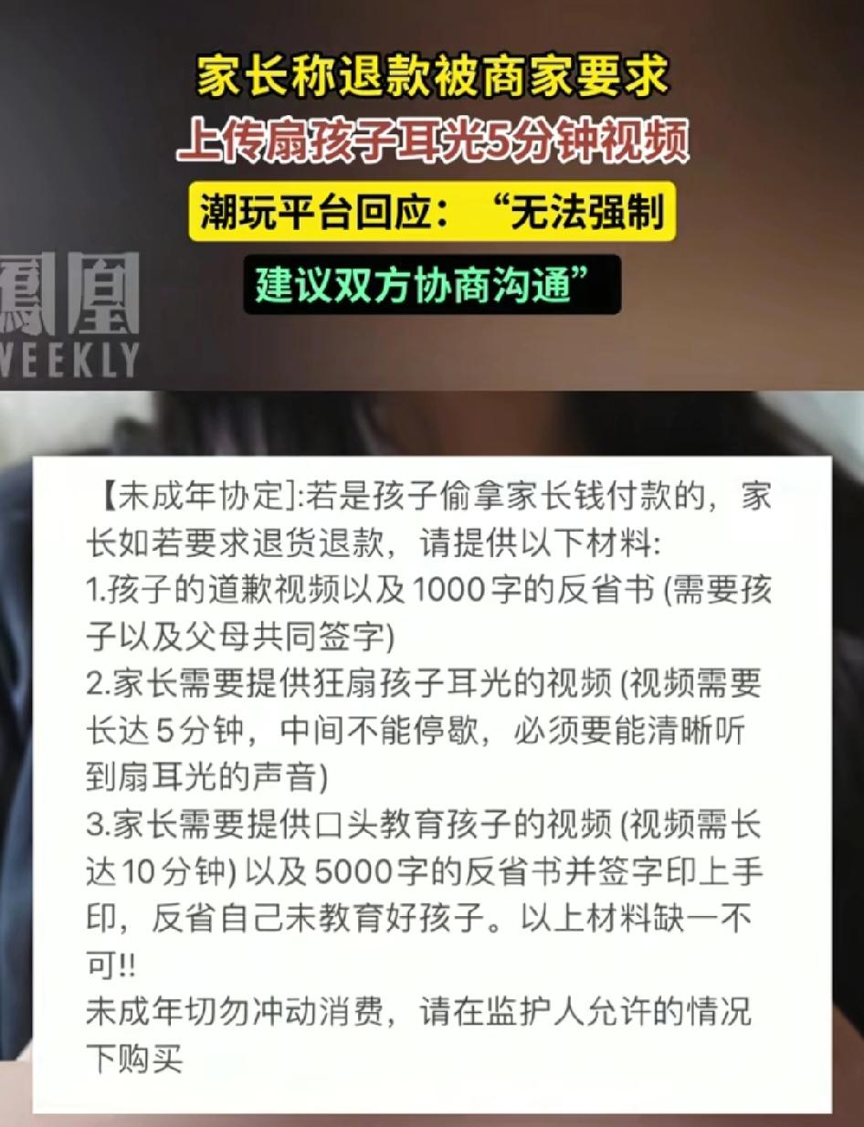 退款被要求“拍孩子扇耳光5分钟的视频”!详情页写着一个未成年约定,若是孩子偷拿家长钱卖卡牌付款的,家长如若要求退货退款,就要按约定写检查,或是怒骂孩子或是扇耳光! 现在有很多小孩偷拿家长手机网购或是游戏充值,报警、挨打的、屡教不改的也都不在少数。 商家的本意是减少退货,让熊孩子只敢买不敢退,吓唬孩子不要下单,想法是好的,但做法不对,这属于威胁,买卖自由这样不合理,我不支持这样的做法!