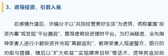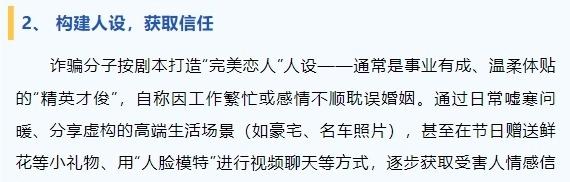 精准定位,锁定目标;构建人设,获取信任;诱导投资,引君入瓮;收网失联,完成诈骗