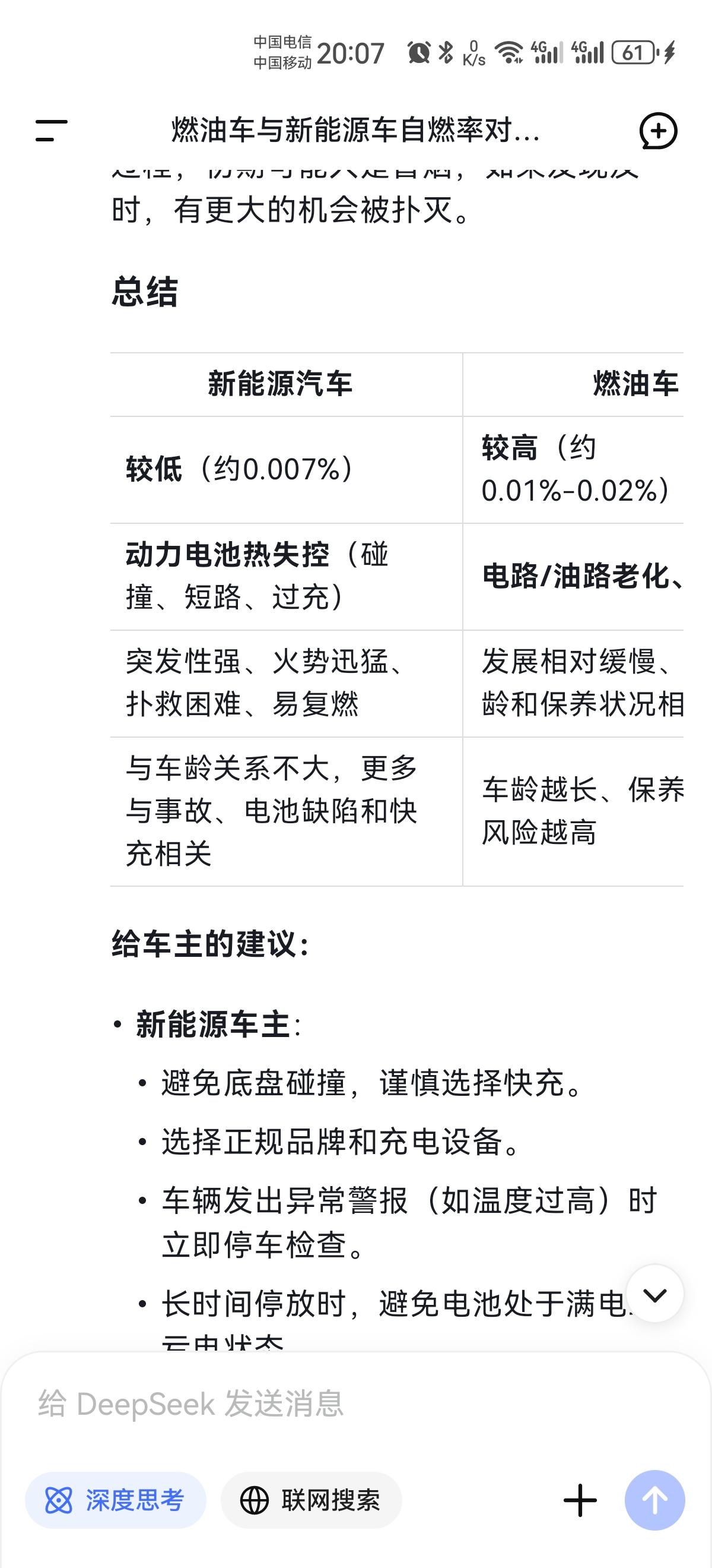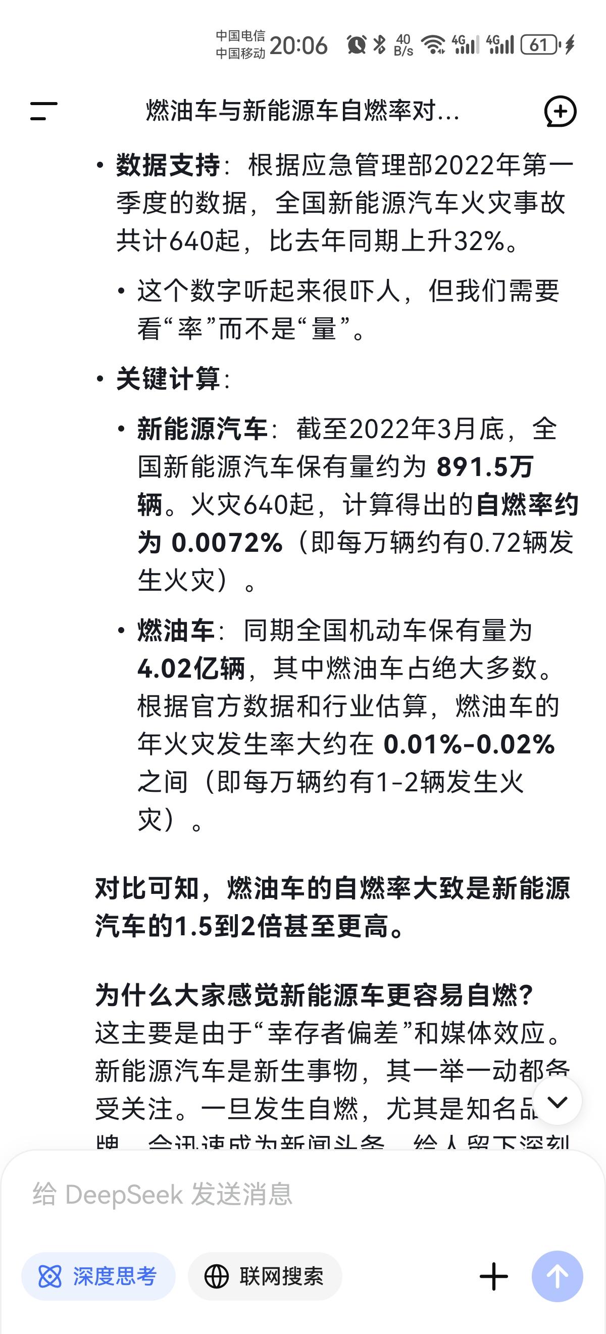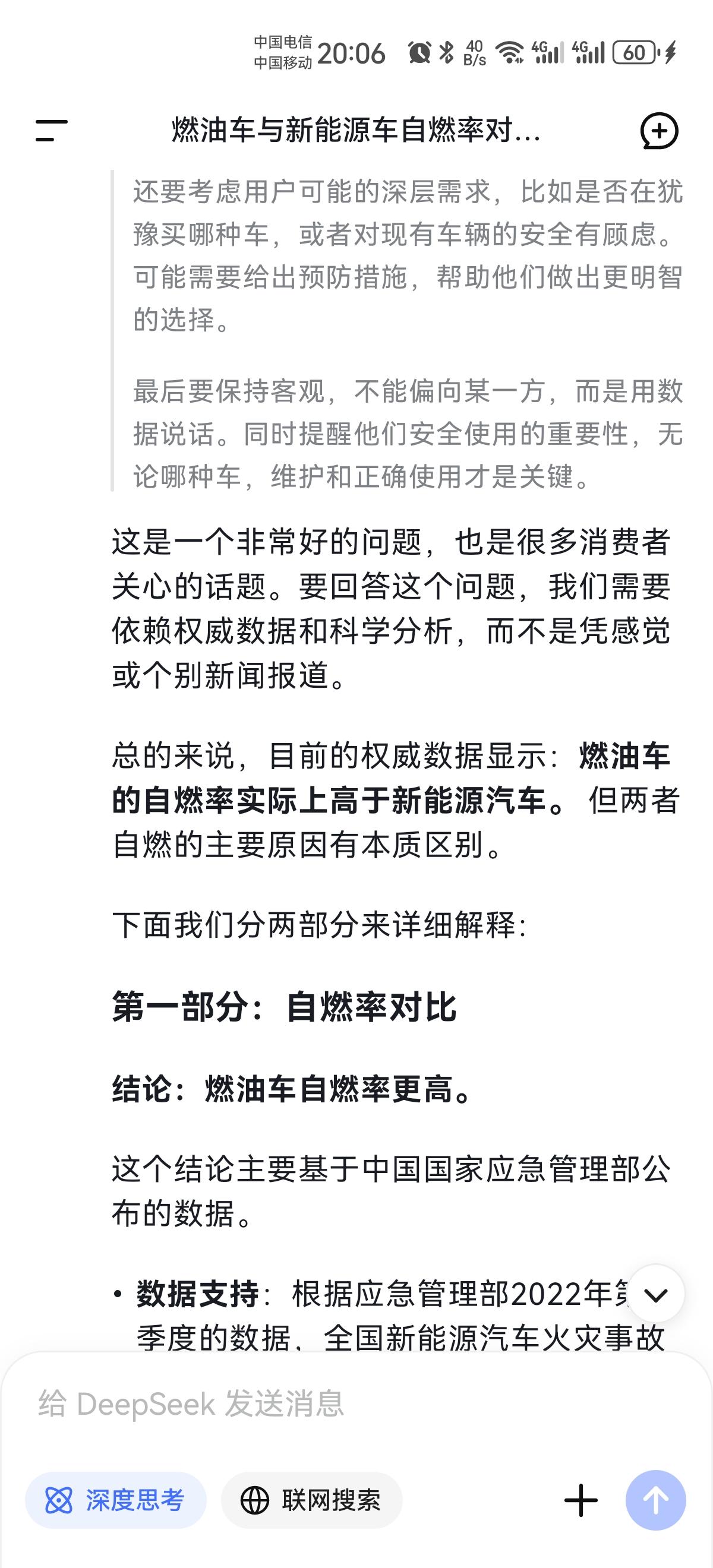 还是Deepseek厉害! 燃油车和新能源车谁的自燃率更高? 为何网络上刷到的都是新能源车自燃? 燃油车自燃事件无人关注吗? 看了答案,选车要慎重!