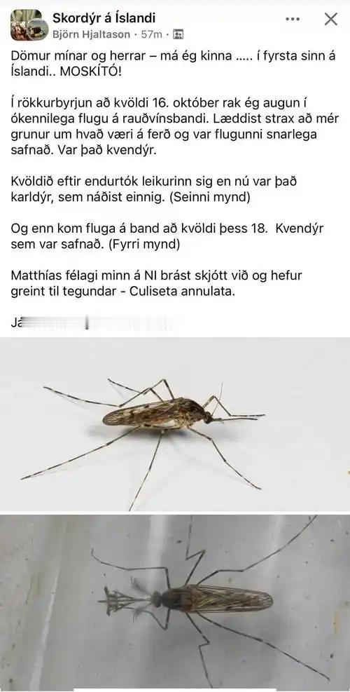 冰岛竟打破了“全球唯一无蚊国”的神话!据《冰岛评论》报道,当地昆虫爱好者哈尔塔森于10月16日晚,在诱捕陷阱中发现3只疑似蚊子。将其送至研究所后,确认是“环跗脉毛蚊”。这是冰岛首次确认有蚊子在户外出现,此前顶多只是在航班上偶尔发现个别蚊子。 哈尔塔森推测,这些蚊子可能来自6公里外的工业区,是通过跨国运输的船只和集装箱被带入的。科学家早有预测,环境变化会使蚊子在冰岛建立种群。看来全球气候与自然环境的变化,真的让物种分布都改变了,冰岛无蚊的日子一去不复返了。 蚊现象 冰岛无蚊 环冰岛 哈基蚊