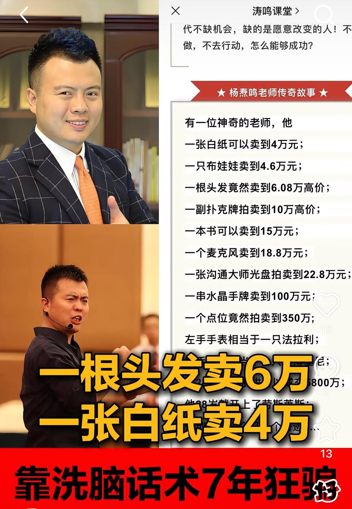 7年敛财3.8个亿 杨涛鸣自诩“成功学大师”,从2009年开始,7年时间里,以各种成功学话术,敛财学员高达3.8亿元。 他不是知名高等学府的高材生,却以“世界顶级潜能开发大师”等头衔,增加自己的权威性,并演说各种开发潜能,快速成功为名,吸引学员听课并缴费培训!并在其中虚构各种成功案例,如:初中学历的人听了他一年课后,拥有豪车豪宅。月入5000的小会计结缘后年入300万!更加厉害的是,以玄学说词,售卖各类“能量产品”,因为带有正能量,可以把一根普通头发标价6万,一张写有“能量”的A4纸卖4万!看看吧,这想不发财都难了吧? 正义或许会迟到,可永远不会缺席!2023年在执法部门的努力侦查并收集证据后,也将东窗事发,最终落入法网!2025年6月一审宣判,杨涛鸣判无期徒刑,没收个人财产,并赔偿3.8亿,他的妻子也被判十二年,罚款600万! 天下哪有免费的午餐,天上哪里会无端端掉馅饼,掉在你手里的都是陷阱!大家千万别贪图便利,就觉得自己能发大财,还是老老实实的赚自己真正付出获得的报酬! 大家说对不? 杨涛鸣诈骗案 “成功学大师”杨涛鸣的背后骗局