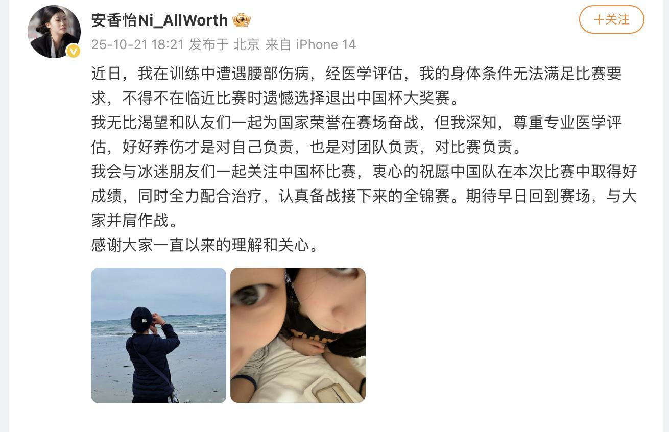 安香怡因伤退出中国杯 发博宣布退出即将开始的中国杯,她写道:“近日,我在训练中遭遇腰部伤病,经医学评估,我的身体条件无法满足比赛要求,不得不在临近比赛时遗憾选择退出中国杯大奖赛。我无比渴望和队友们一起为国家荣誉在赛场奋战,但我深知,尊重专业医学评估,好好养伤才是对自己负责,也是对团队负责,对比赛负责。”