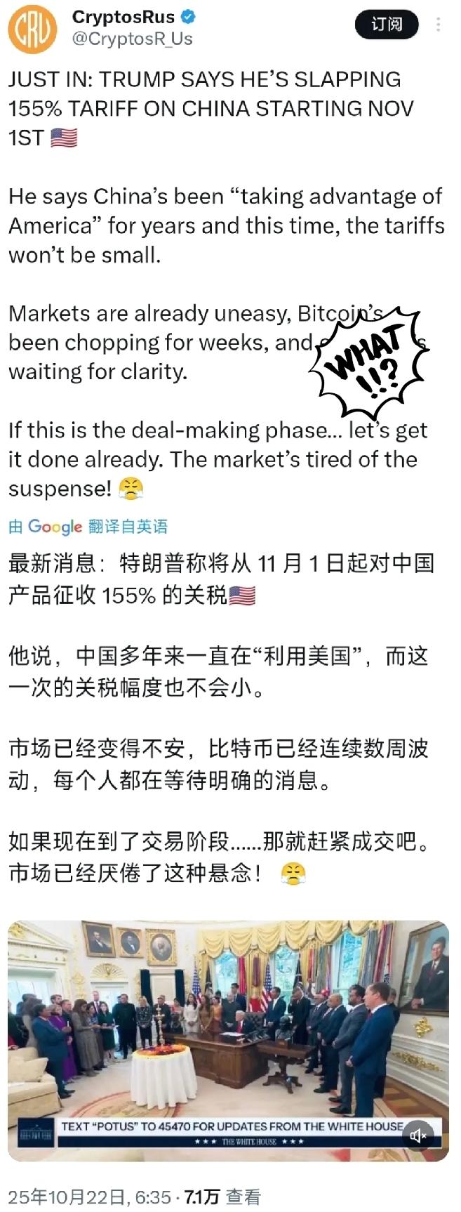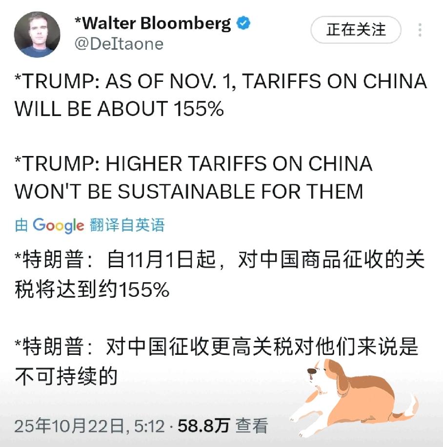 “三板斧”,又要抡起来了 最新消息显示,特朗普称,自11月1日起对中国商品征收155%关税。同时,他认为征收更高关税对于中方来说是不可持续的。 怎么看呢? 谈一些粗浅的看法吧。 三天前,来自特朗普的最新社交动态显示过155%这个数字,看来,经过思考,他还是要动加税这个“歪脑筋”。 在最新动态中,他用了利用与不可持续两个词。 要我看,他只说对了30%。 为什么是30%呢? 首先,利用这个说法就大错特错,贸易是互利的,合作也是互利的,怎么是利用呢? 不然,美国企业在东方大市场赚的就不是真金白银,而是做慈善。 其次,不可持续这句话,他说对了,只是说反了,不可持续的是美方,否则贝森特为什么急了? “三板斧”抡起来虎虎生风,然后呢?全砸自己脚上了…… 最后,我有一种感觉,他的幕僚又买股票了,这是高抛低吸的再次登场。 您说呢?
