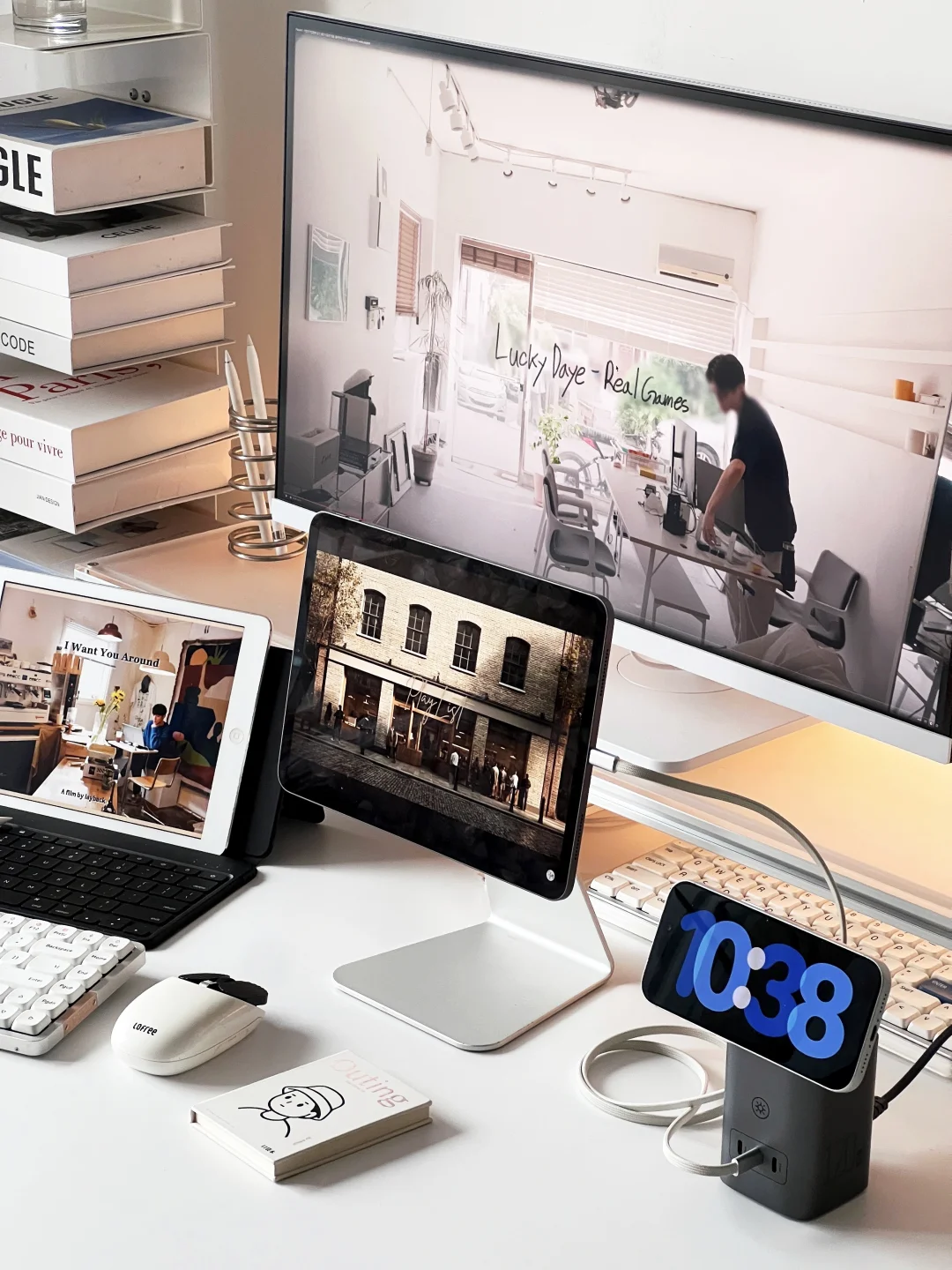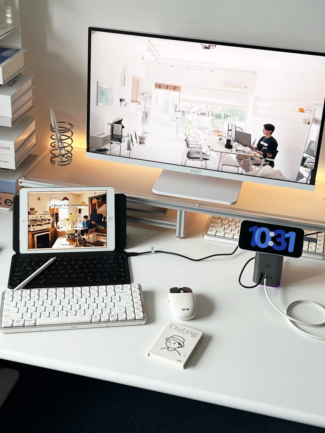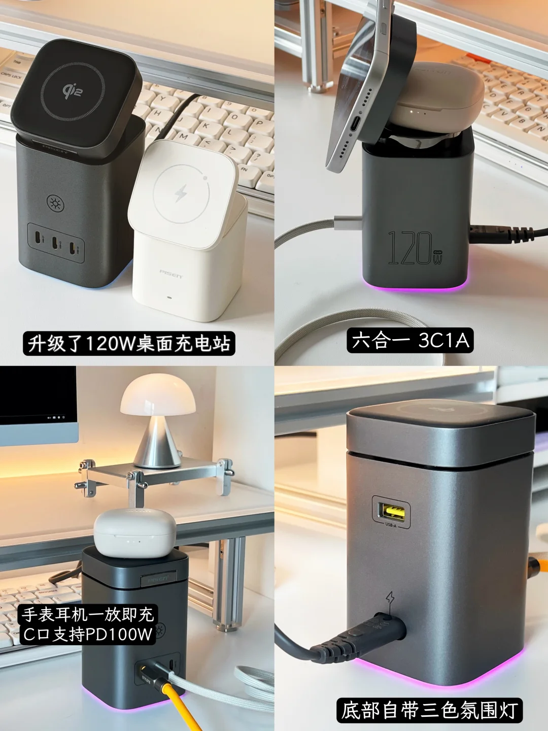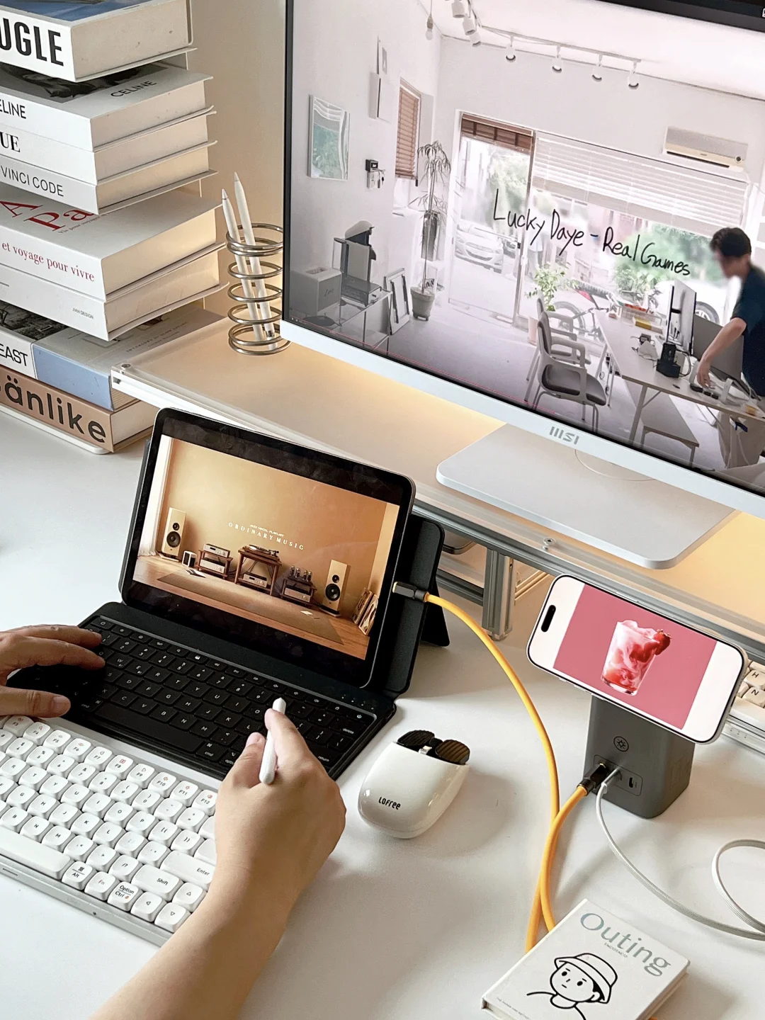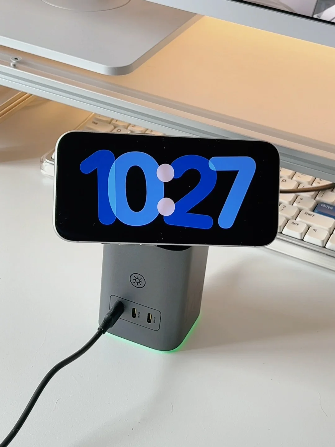 对于数码桌搭,我终于发现最大的杂乱,来自那些缠绕的充电线。手机、平板、耳机各插一根线,桌面瞬间没了呼吸感。 果断升级了我的书桌桌面充电站,一切变得干净有序。一个小方块,四个接口加上Qi2磁吸无线充,手机轻轻一放就开始补电,iPad、MacBook也能同时待命。嘿嘿! 现在桌面只留一根主电源线, 干净、整齐,终于有点极简桌搭的样子了。