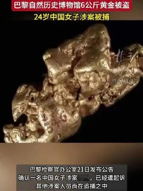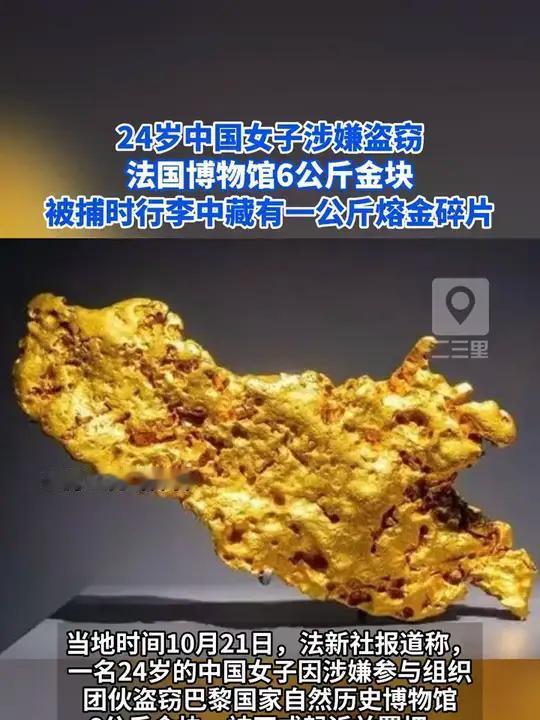 10月21日消息,一名24岁的中国女子因涉嫌盗窃法国国家自然历史博物馆馆藏的黄金原石而被起诉。这起盗窃案发生在9月16日,失窃展品包括18世纪玻利维亚赠予的金块等,总重近6公斤。按原石金价估算,损失约150万欧元,另有约5万欧元的设备损失,且这些展品的历史与科学价值无法估量。 该女子于9月30日在巴塞罗那被捕,当时她正企图处理近1公斤已熔化的黄金碎片。10月13日,她被移交给法国方面。若罪名成立,她可能面临最高15年监禁。检察官推测,她或许是犯罪网络的关键协调人,实际执行者可能是法国本地或东欧团伙,目前其他嫌疑人的细节尚未公布。 法国博物馆盗窃 卢浮宫盗窃案 卢浮宫珠宝失窃 黄金手饰失窃案 黄金失窃案 黄金盗窃 卢浮宫藏品盗窃