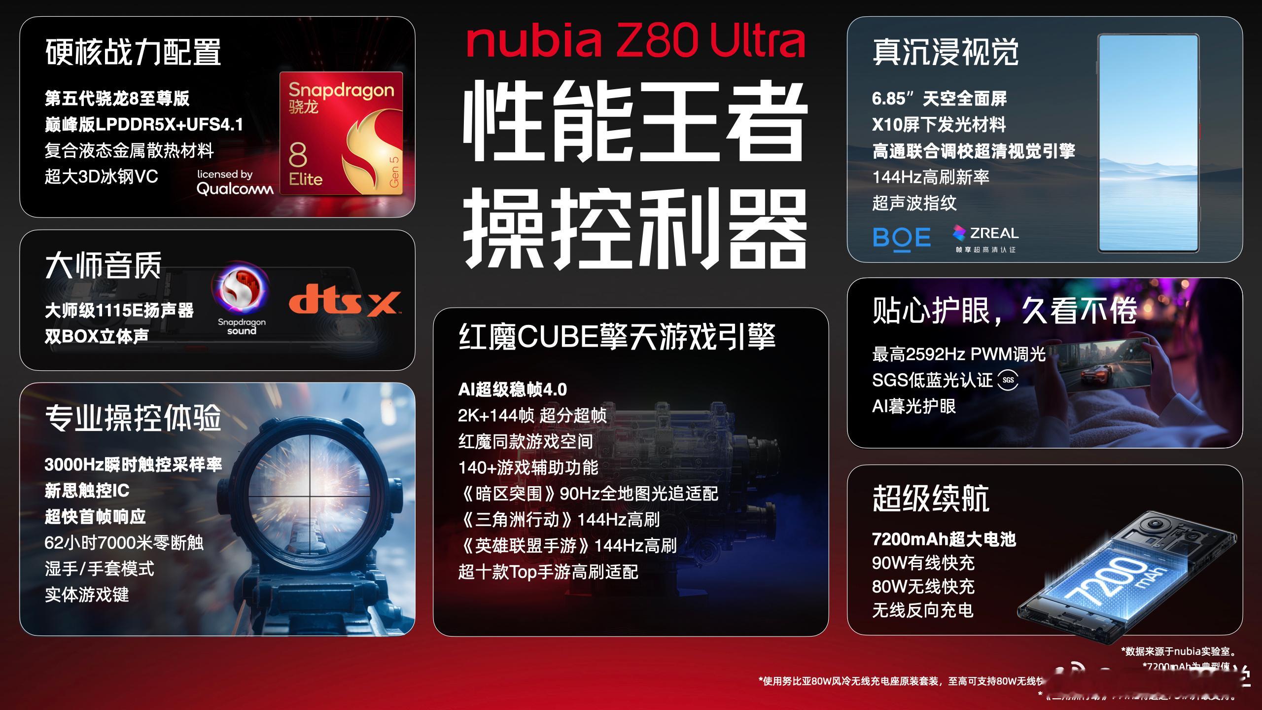 性能搭载第五代骁龙8至尊版,配合红魔同款CUBE擎天游戏引擎与超强散热,6.85英寸天空全面屏加持,7200mAh电池保障续航,且适配多款高刷游戏。