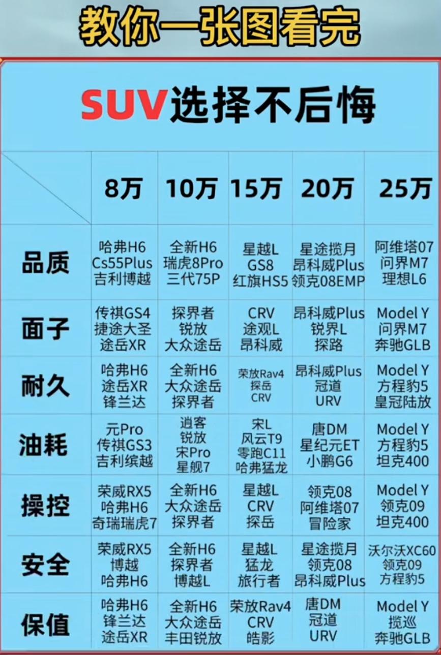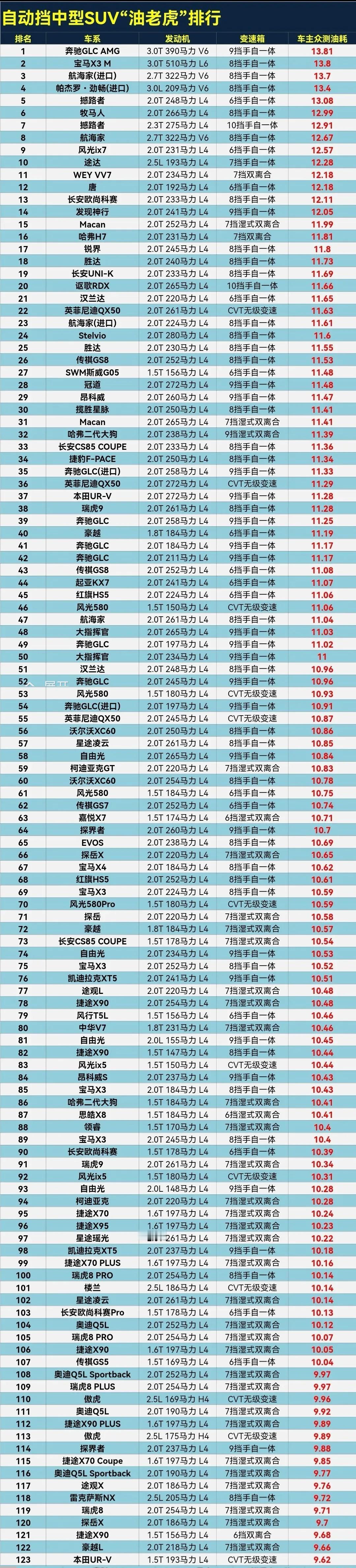 SUV分级一般有小型、紧凑型、中型、中大型和大型等。在油耗方面,如今可是大家选车的重要参考。 从2025年紧凑型SUV(不含混动)油耗排名TOP50来看,8个油都进不了前15。起亚赛图斯夺冠,车主众测油耗7.16L,大众途岳百公里油耗约7.3L。捷达VS5、卡罗拉锐放、丰田威兰达入榜前五,捷达VS5车主众测油耗7.42L左右。入榜前十的还有奇瑞瑞虎7 PLUS、大众探歌等。 合资车在油耗排行表现出色,入榜前十有7款。不过日系SUV无缘前三,倒是起亚赛图斯拔得头筹。国产车也有奇瑞瑞虎7 PLUS、启辰大V等入榜。像吉利星越L排名就比较靠后,在48、49位。 这是从省油角度来看,对于大佬以舒适度体验感来排行的油老虎榜,请看下图。