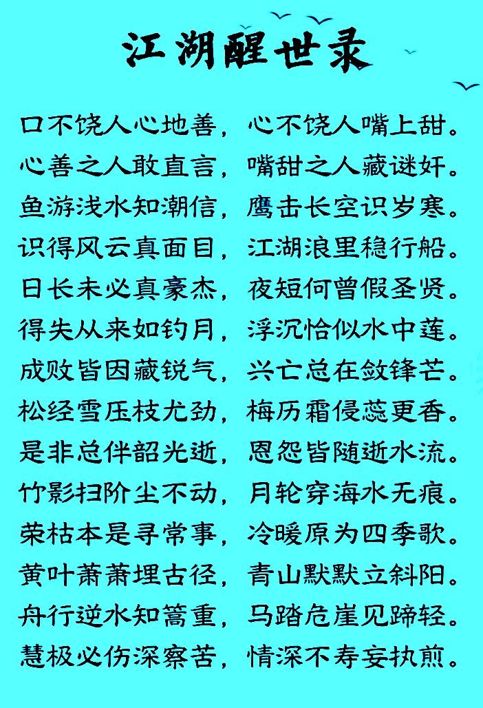 闭嘴少惹祸 守心不出错 见人话少说 闲事别掺和 为人守底线 做事有分寸 修好自己心 立好自己德